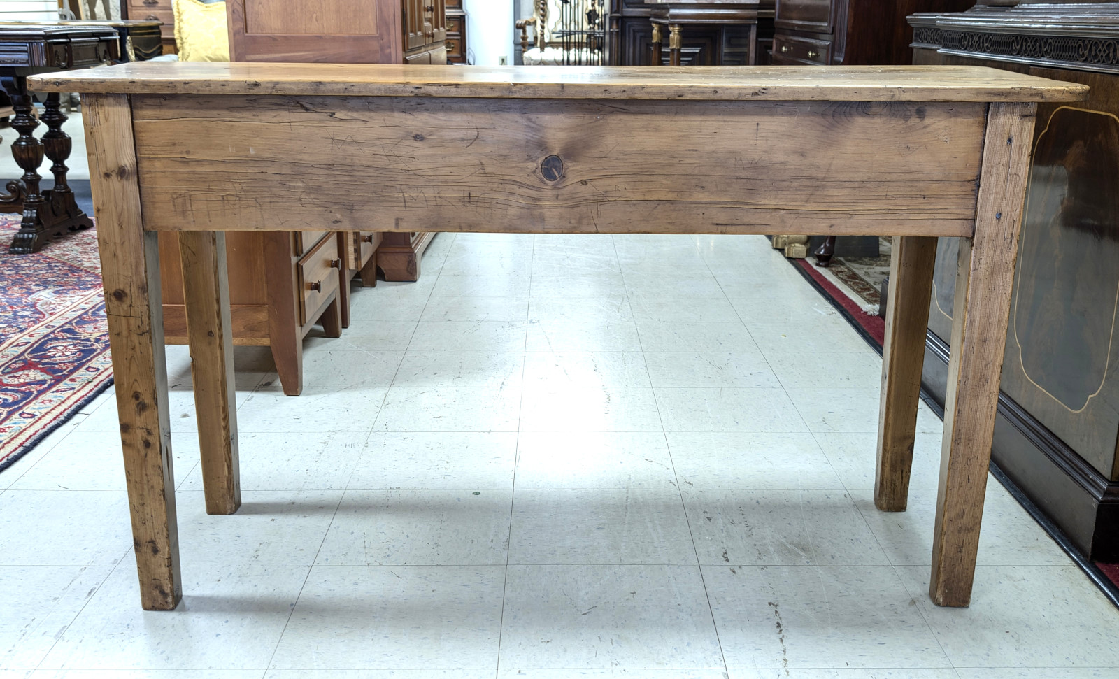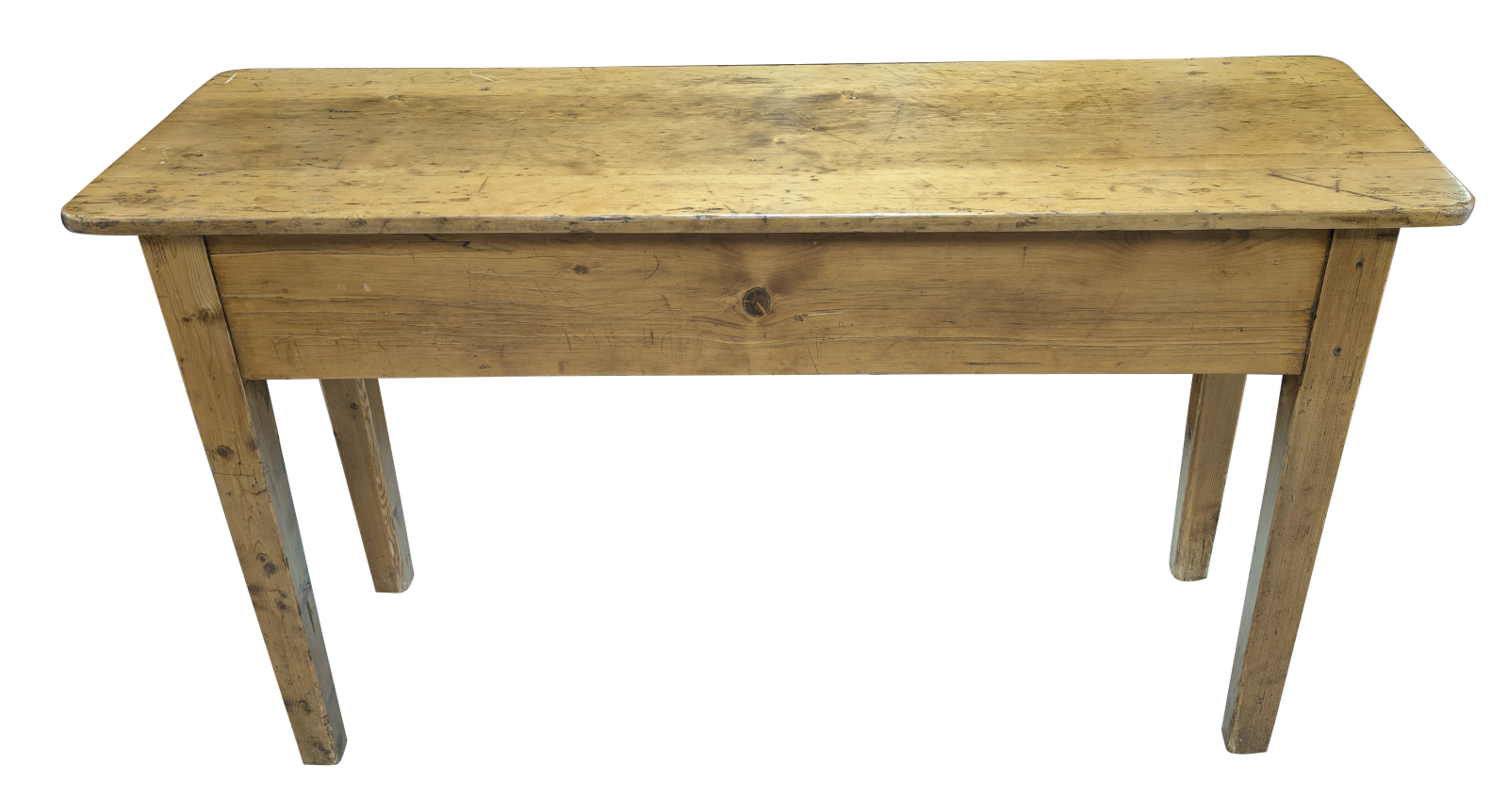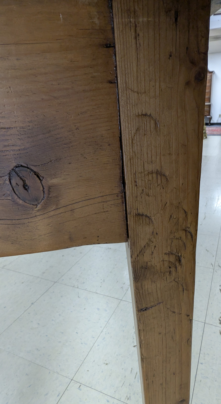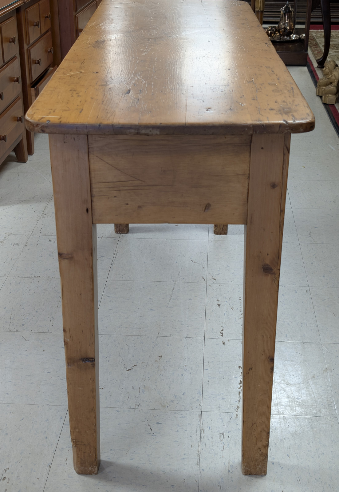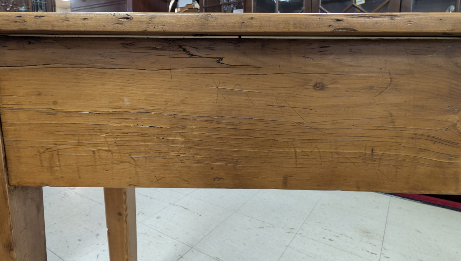 A charming and authentic rustic pine farmhouse table, showcasing a timeworn plank top with softly rounded edges above a simple apron and square legs. Crafted in solid pine, the table displays a warm, honeyed patina enriched by decades of honest use. The surface bears a multitude of marks, scratches, and characterful wear, giving it the highly sought-after lived-in aesthetic prized in farmhouse and primitive interiors.