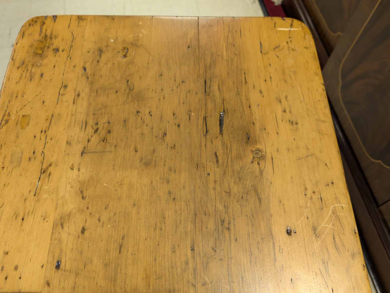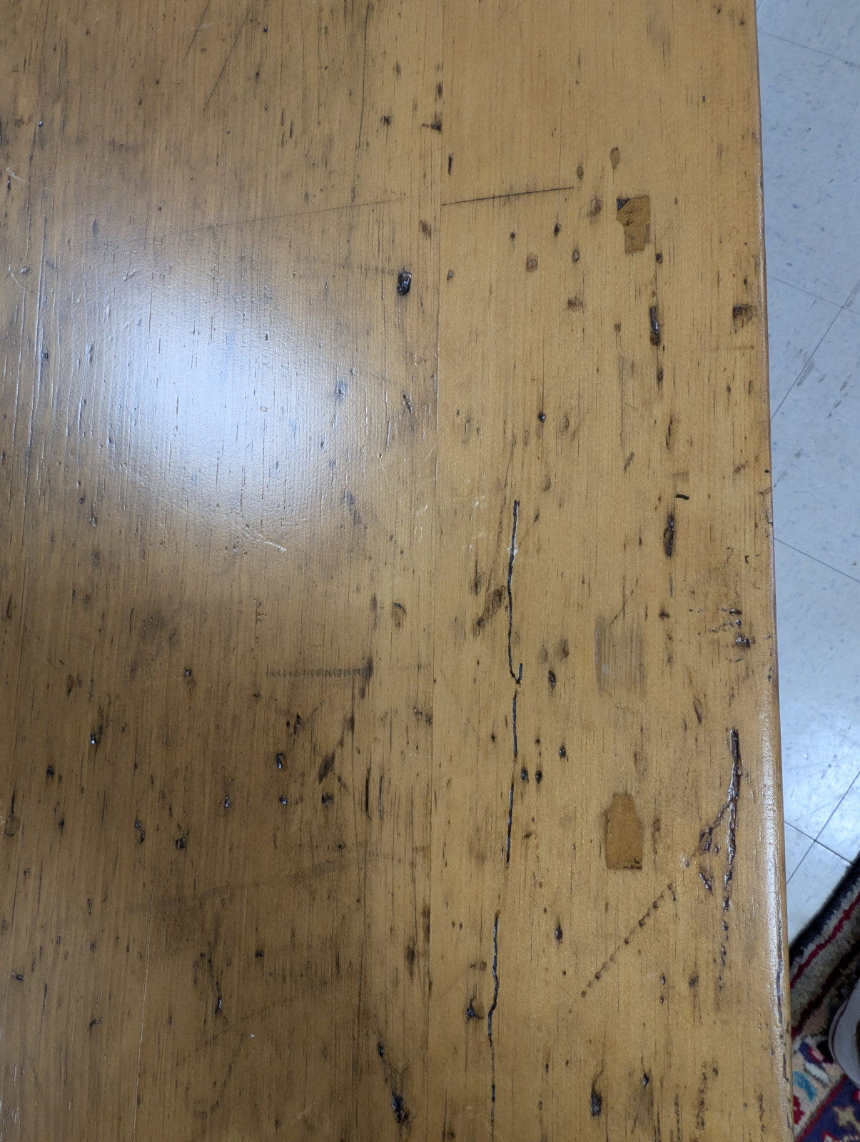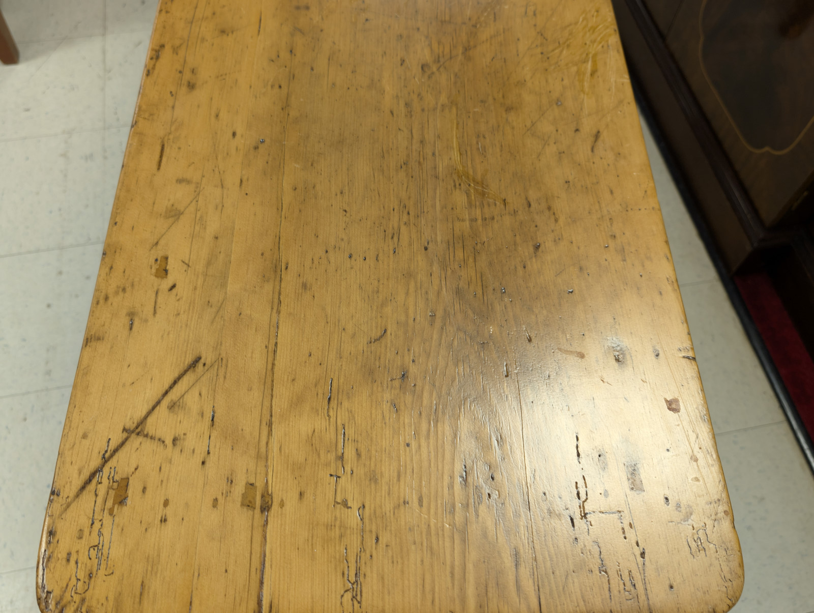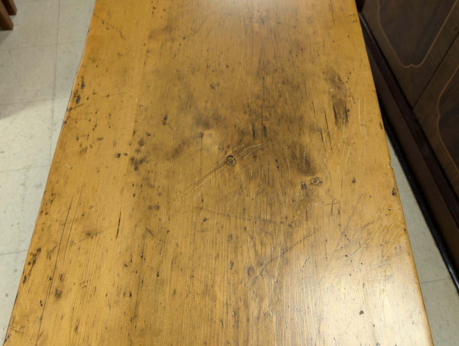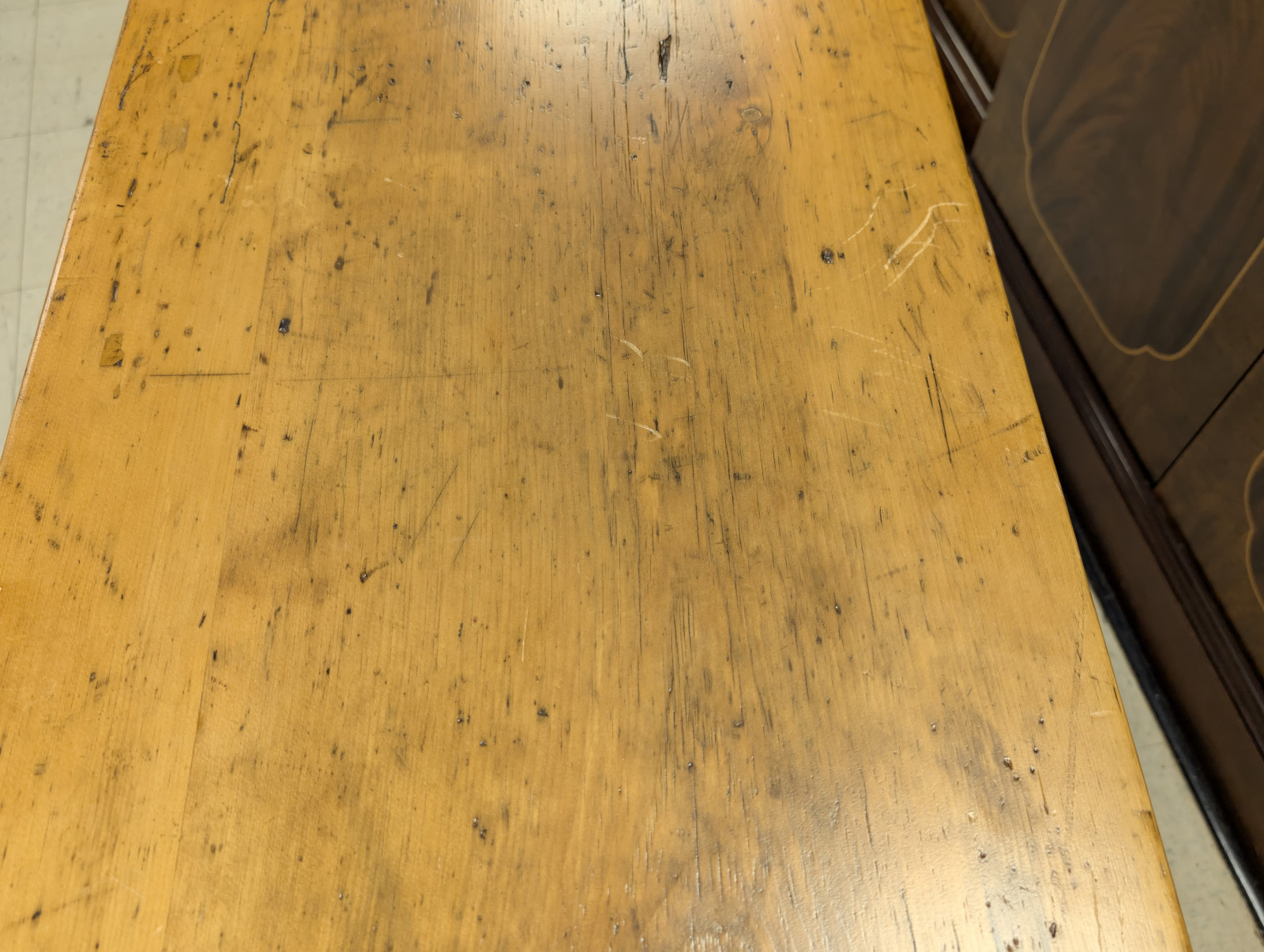 Very good, sturdy antique condition with heavy surface wear consistent with age and use, including scratches, stains, and minor edge wear. Strong and stable.