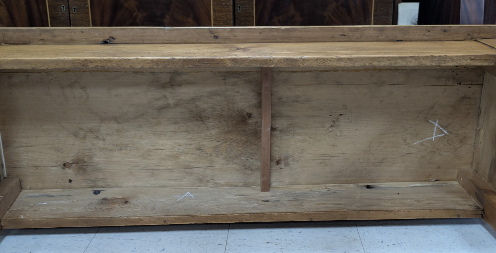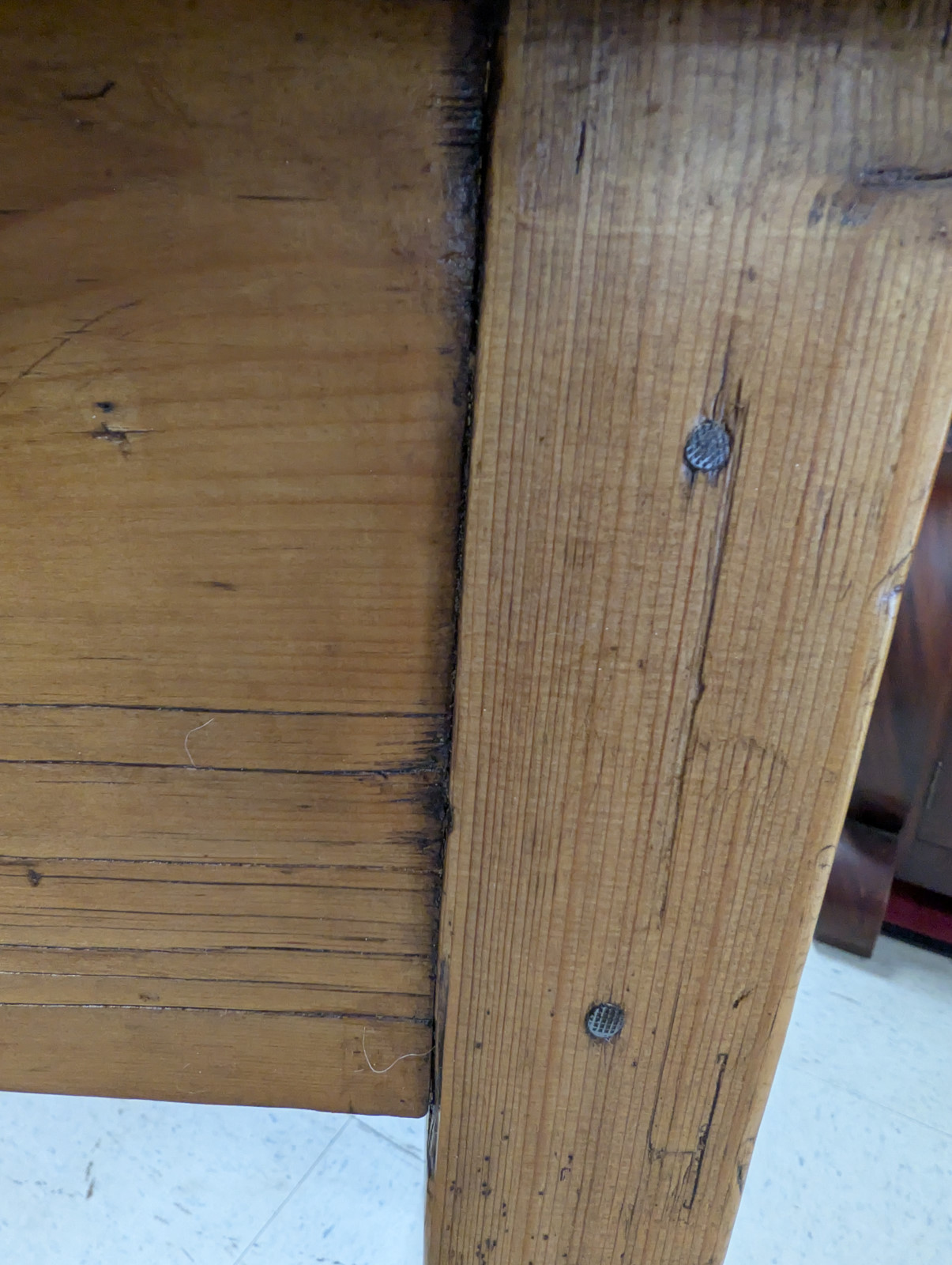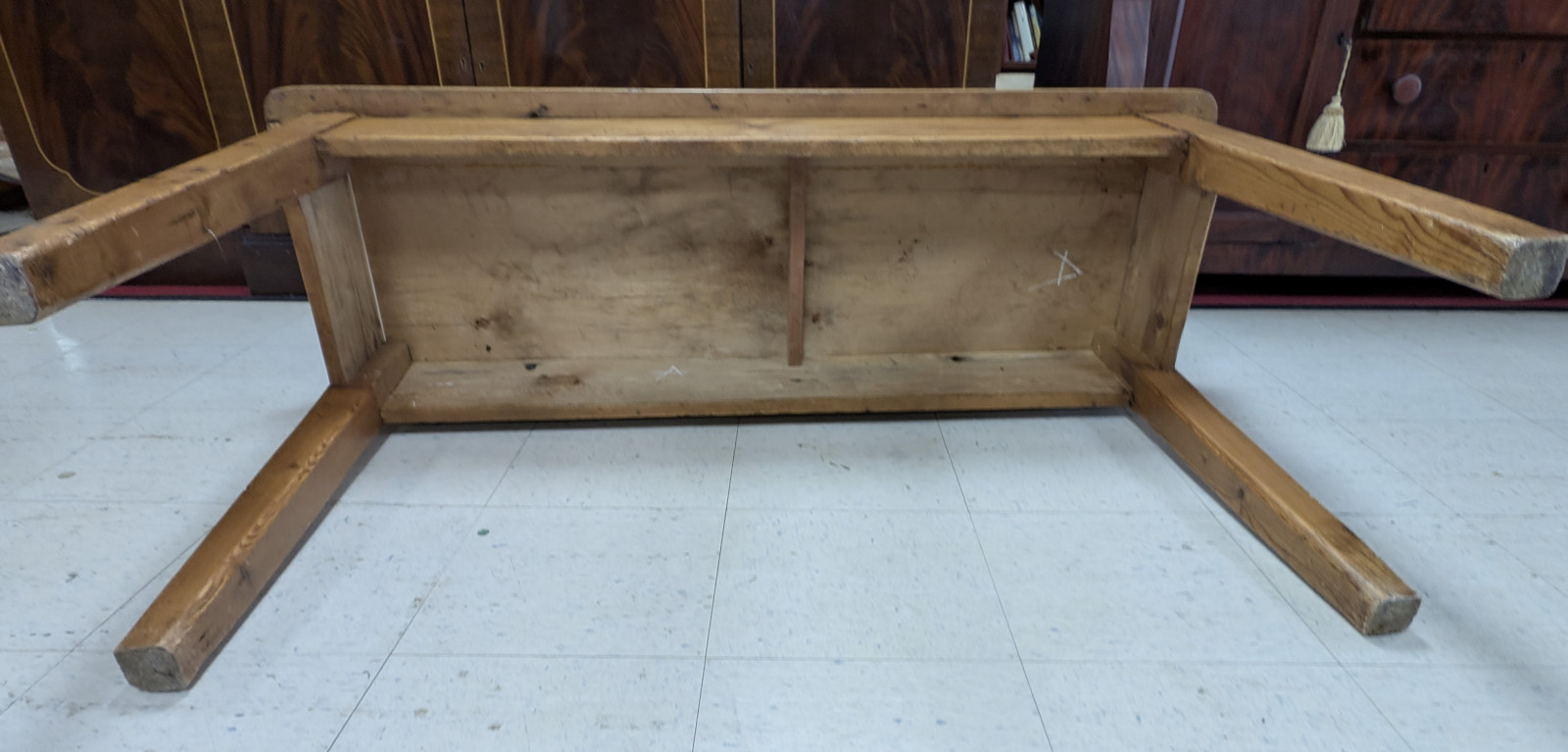 The construction is straightforward and utilitarian, with visible pegged and nailed joinery, consistent with early country craftsmanship. The underside reveals reinforcing stretchers and hand-worked elements, further supporting its practical origins as a kitchen work table, prep surface, or general utility bench.