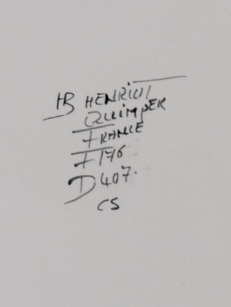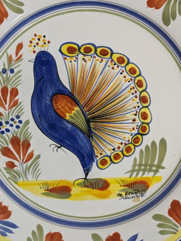 Markings: Dinner Plate ~ HB Henriot Quimper France F176 D407 CS, Peacock Wall Plate ~ F. 6 D. G? LP C France (Signed on front HB Henriot Quimper), Bird Wall Plate ~ F6 D12 NFC France (Signed on front HB Henriot Quimper)