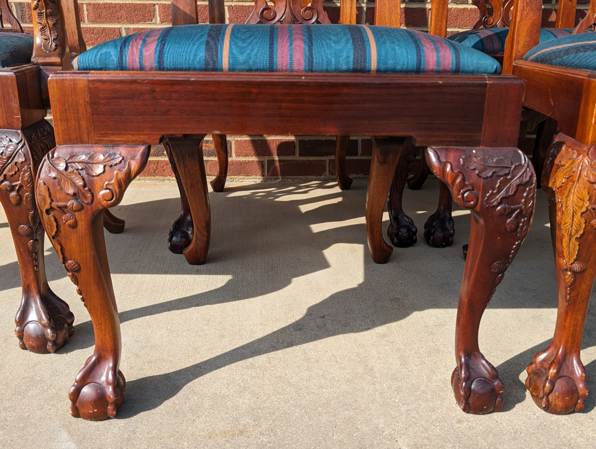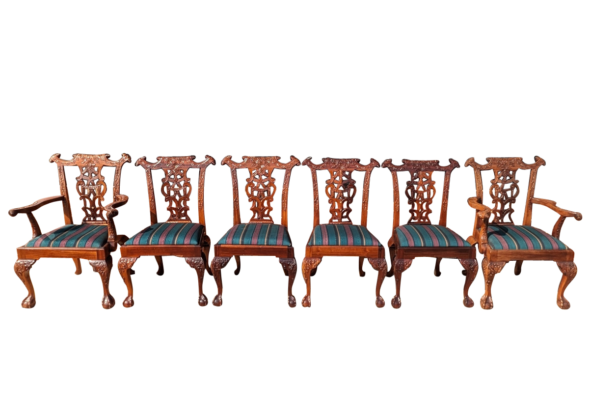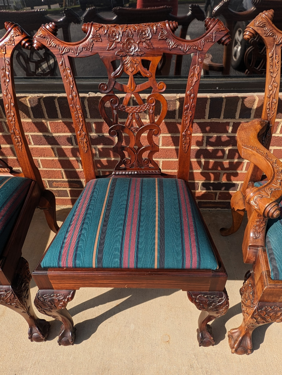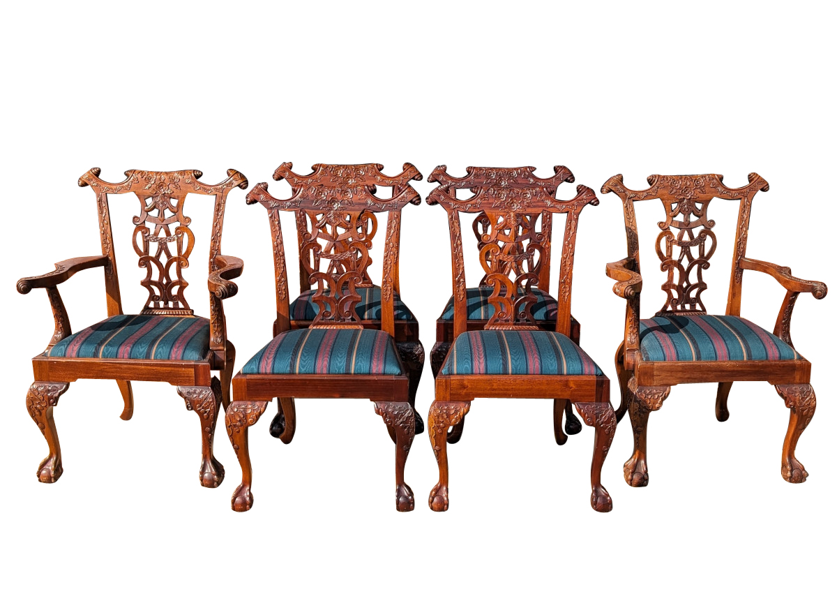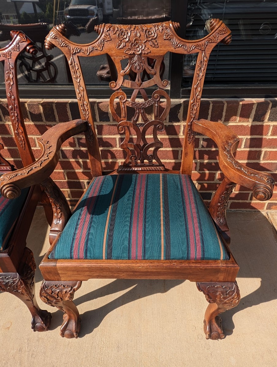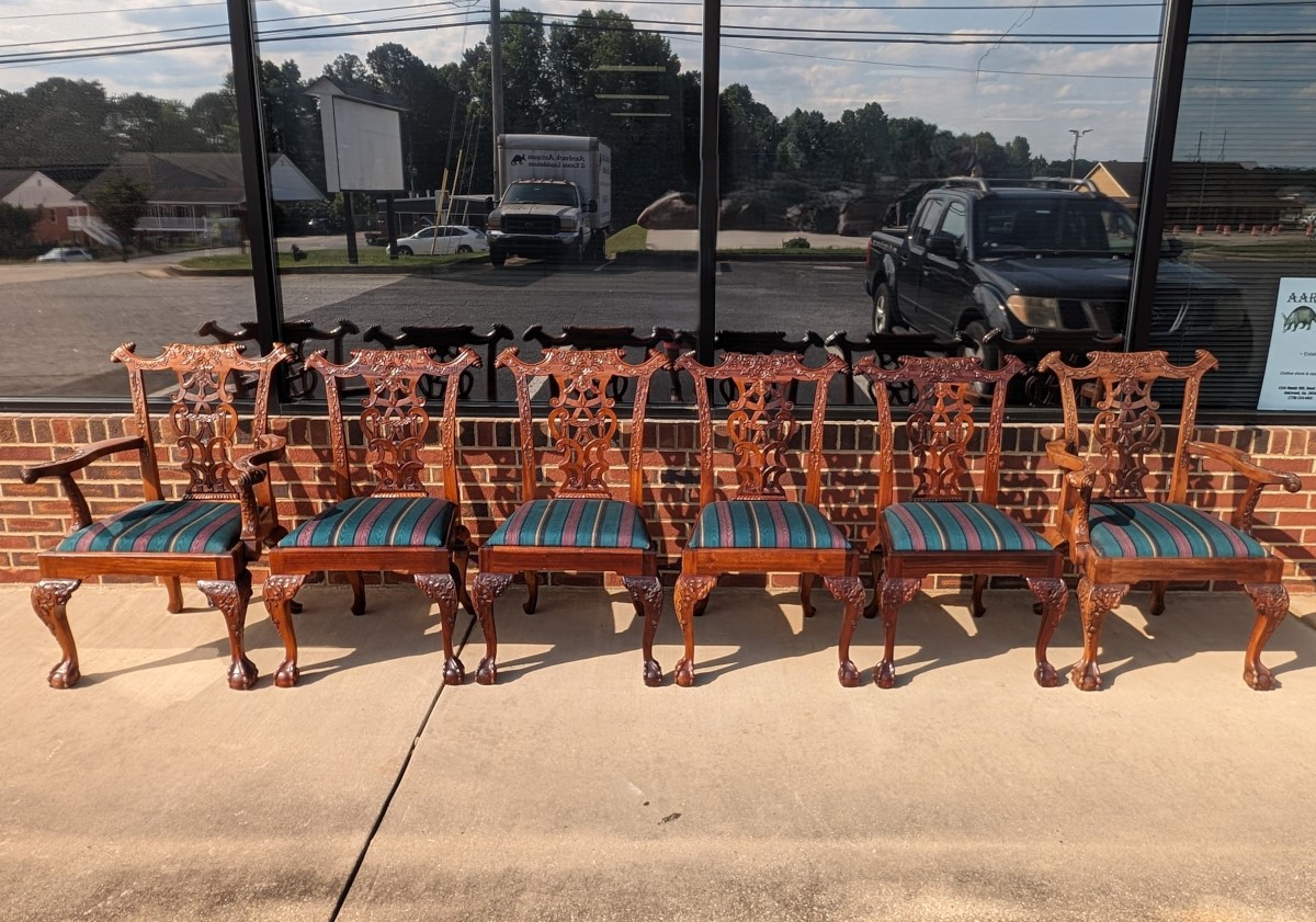 Gorgeous Chippendale style chairs, Early 20th Century, 2 Armchairs, 4 Side Chairs, Solid Mahogany frame, Heavily carved, Removable upholstered seats, Paw feet. In very good sturdy condition, minor wear, scratches and dings due to age and use, some fading of wood on a couple of chairs, Two armchairs lighter than group due to fading of wood. Measures: Armchairs 39″H x 29″W x 24″D. Seat 19″H. Arm 27″H. Side Chairs 38.5″H x 24.5″W x 21.5″D. Seat 19″H.