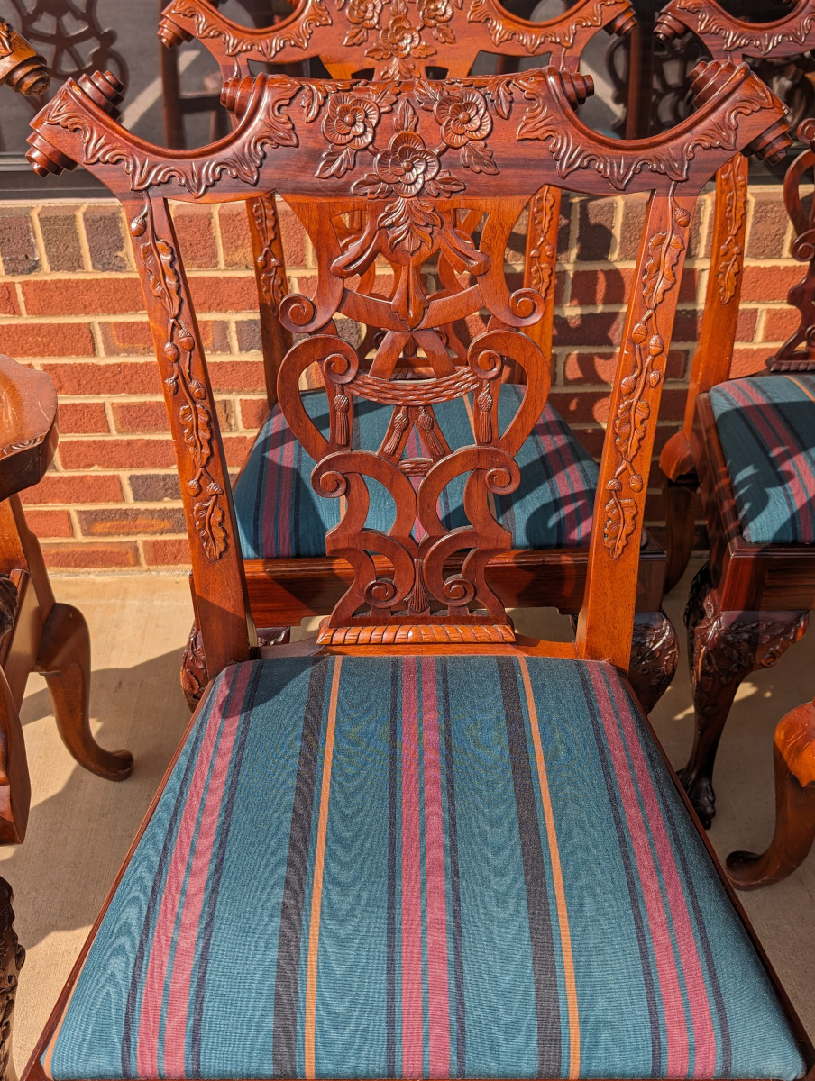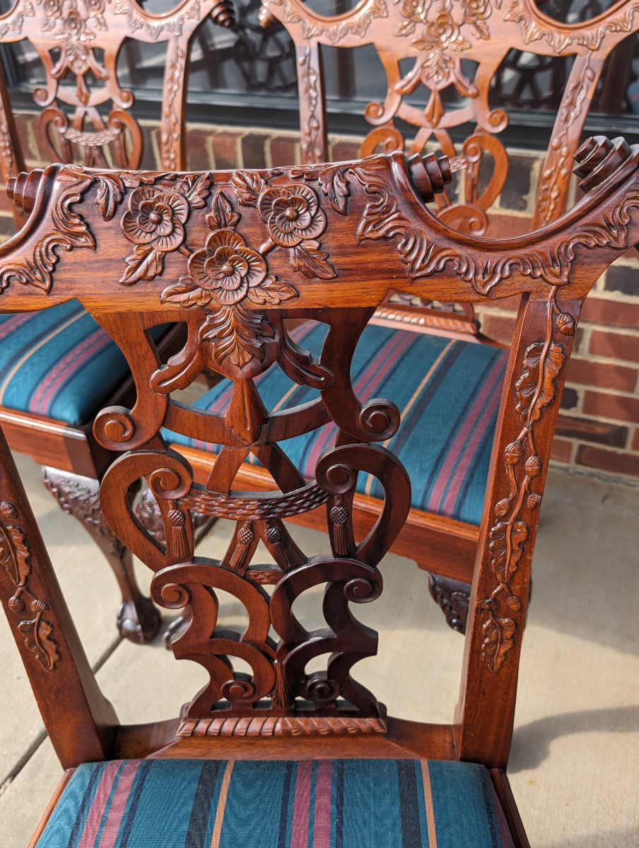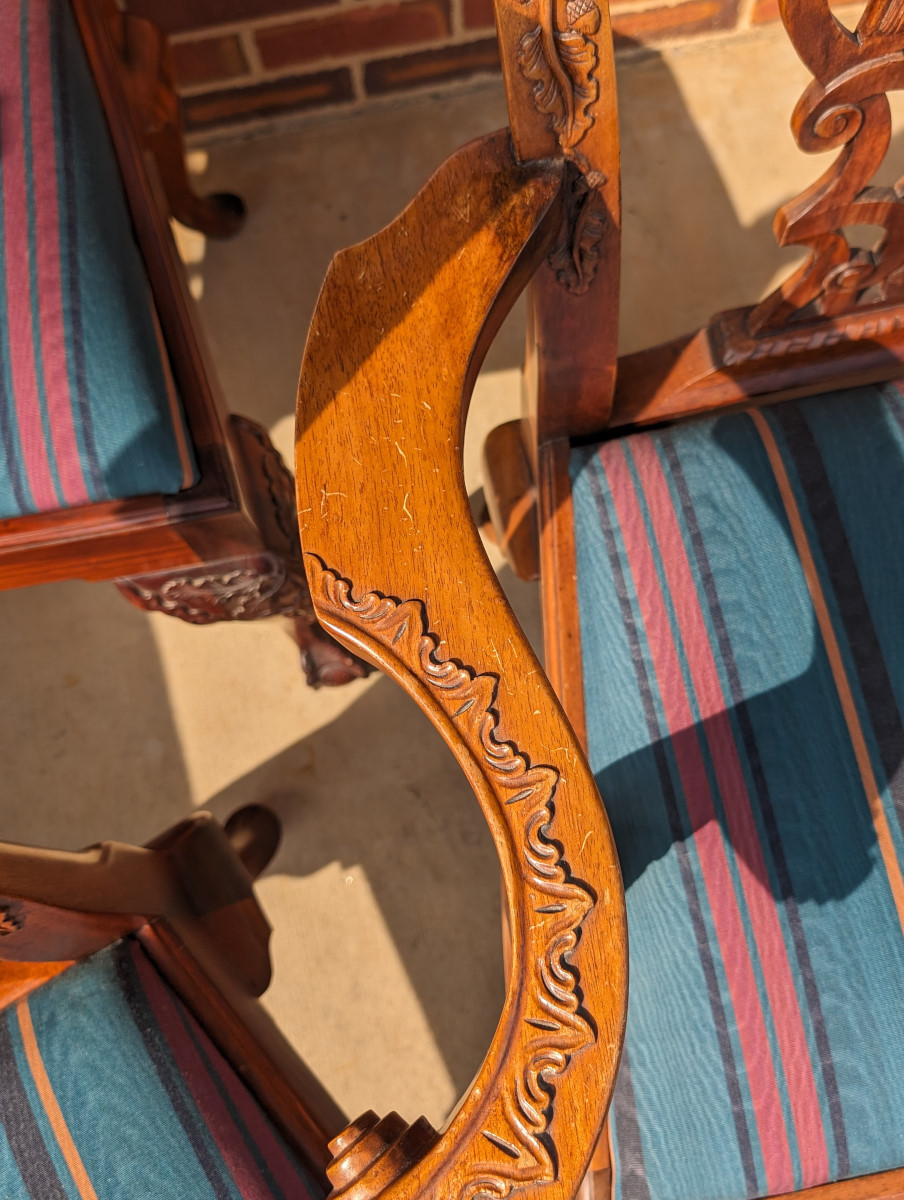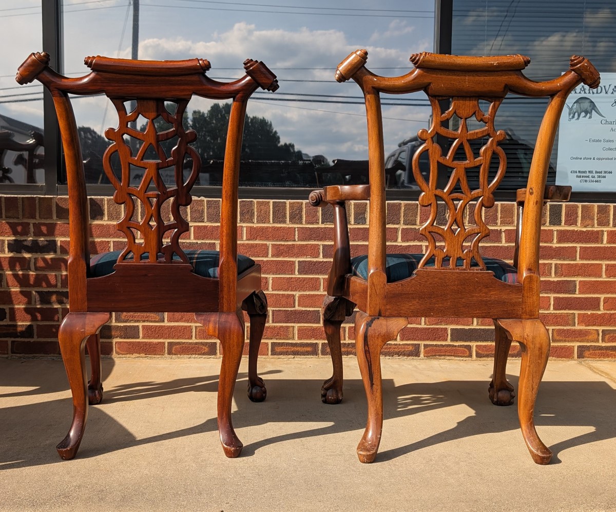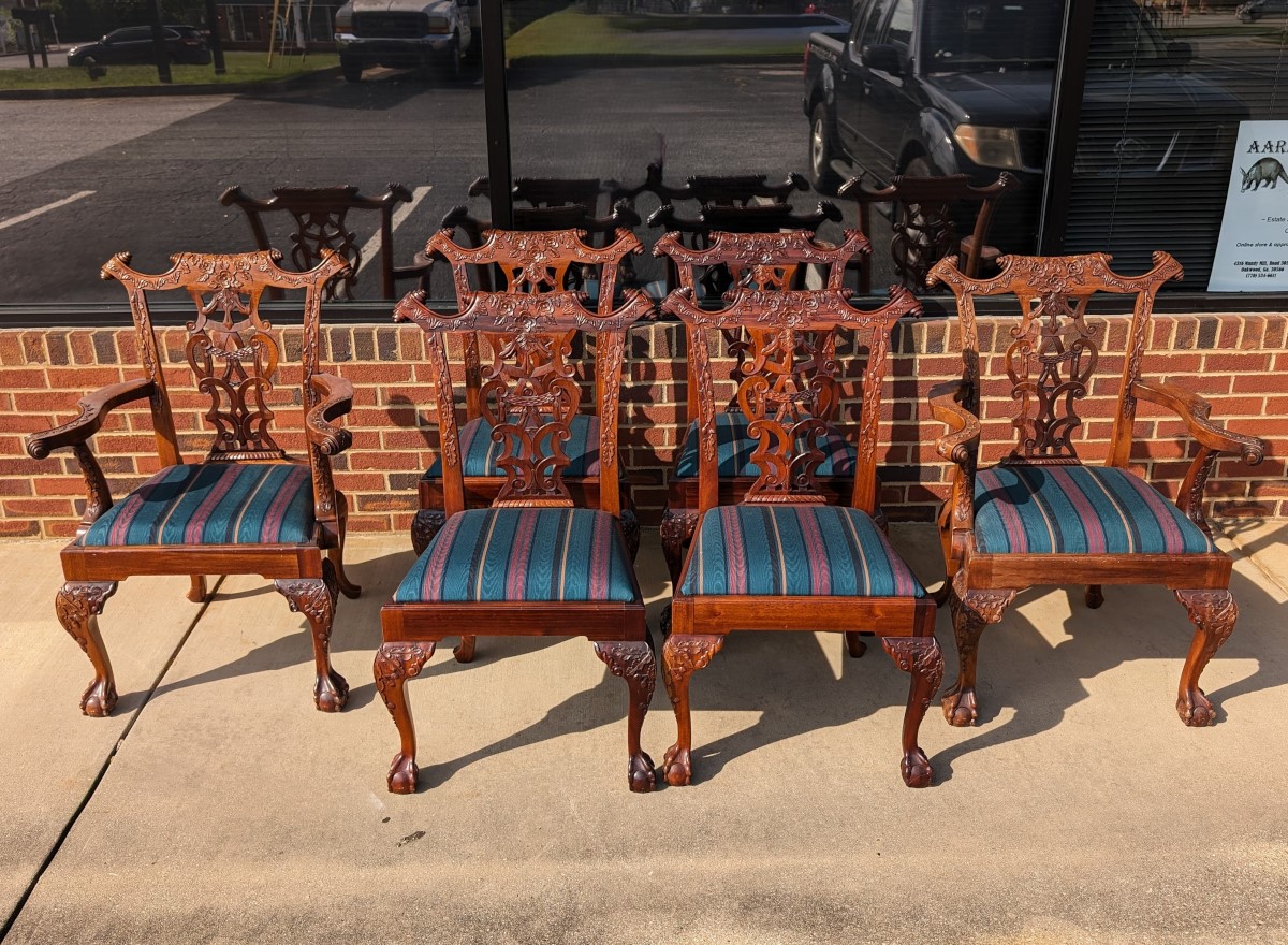 Gorgeous Chippendale style chairs, Early 20th Century, 2 Armchairs, 4 Side Chairs, Solid Mahogany frame, Heavily carved, Removable upholstered seats, Paw feet. In very good sturdy condition, minor wear, scratches and dings due to age and use, some fading of wood on a couple of chairs, Two armchairs lighter than group due to fading of wood. Measures: Armchairs 39″H x 29″W x 24″D. Seat 19″H. Arm 27″H. Side Chairs 38.5″H x 24.5″W x 21.5″D. Seat 19″H.