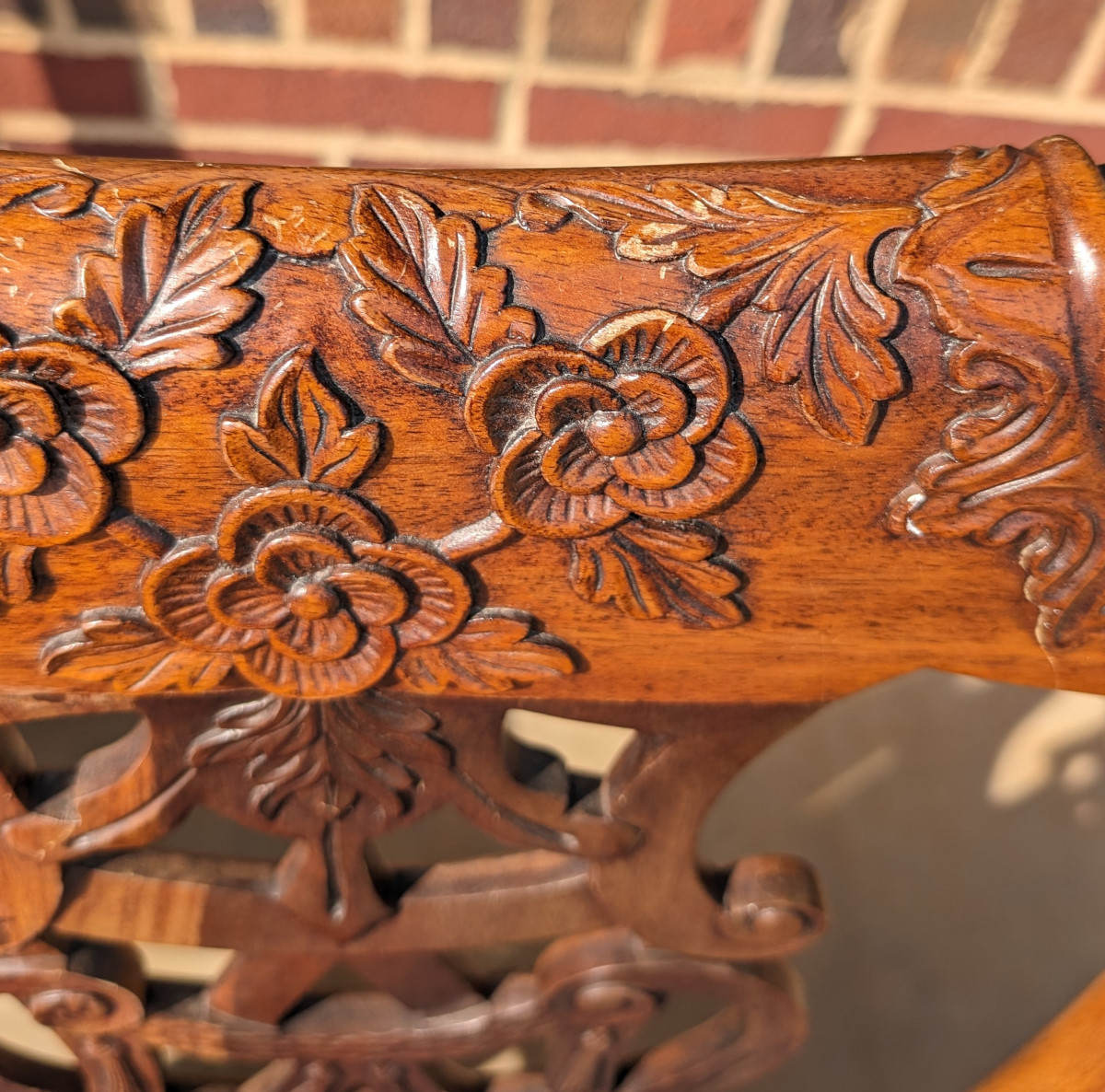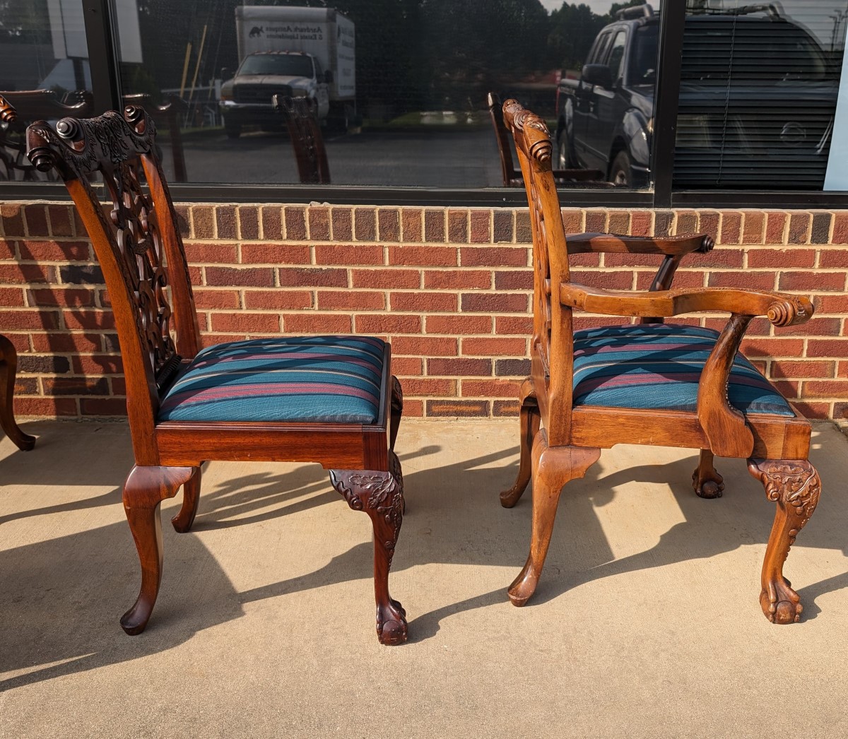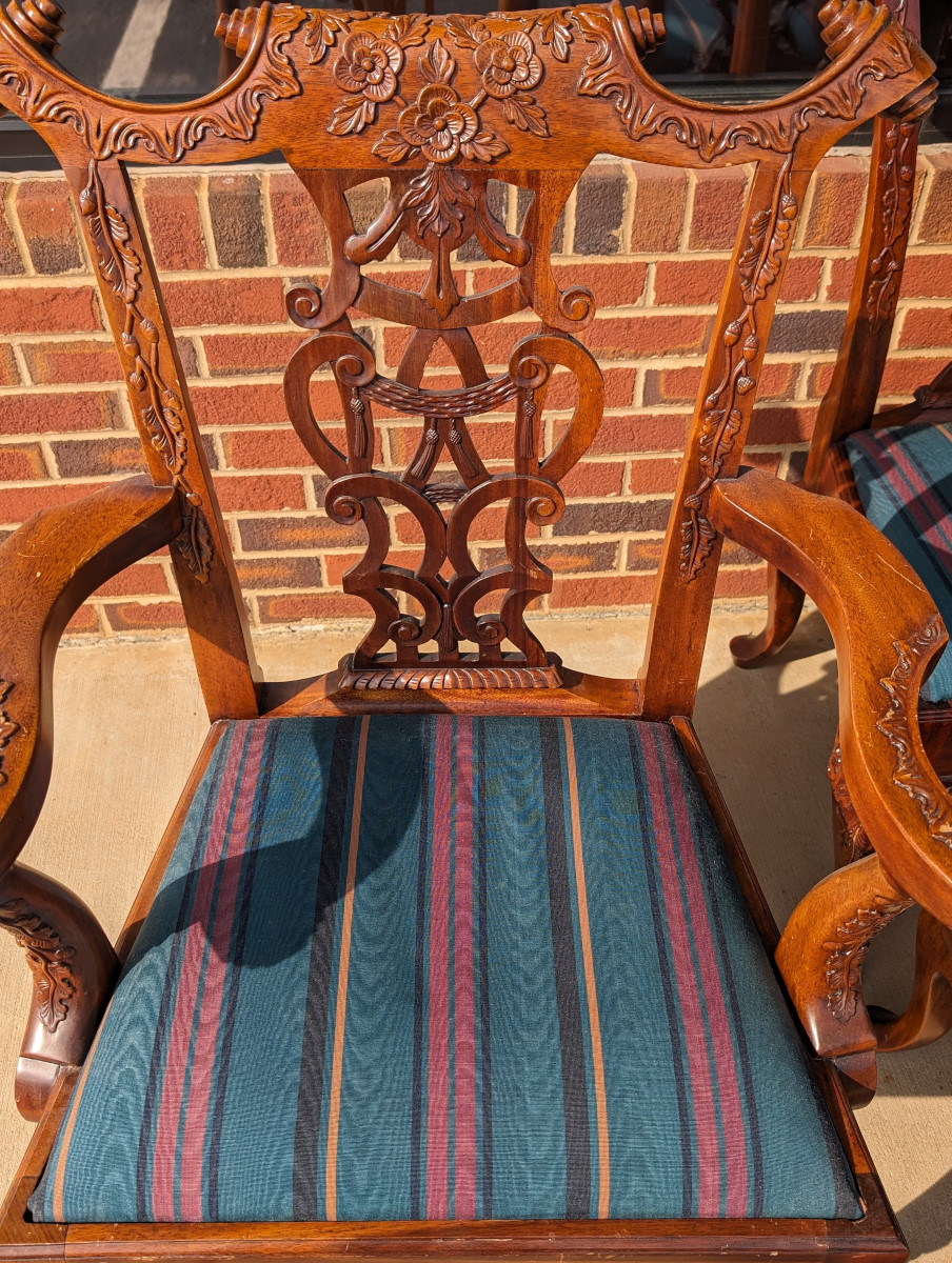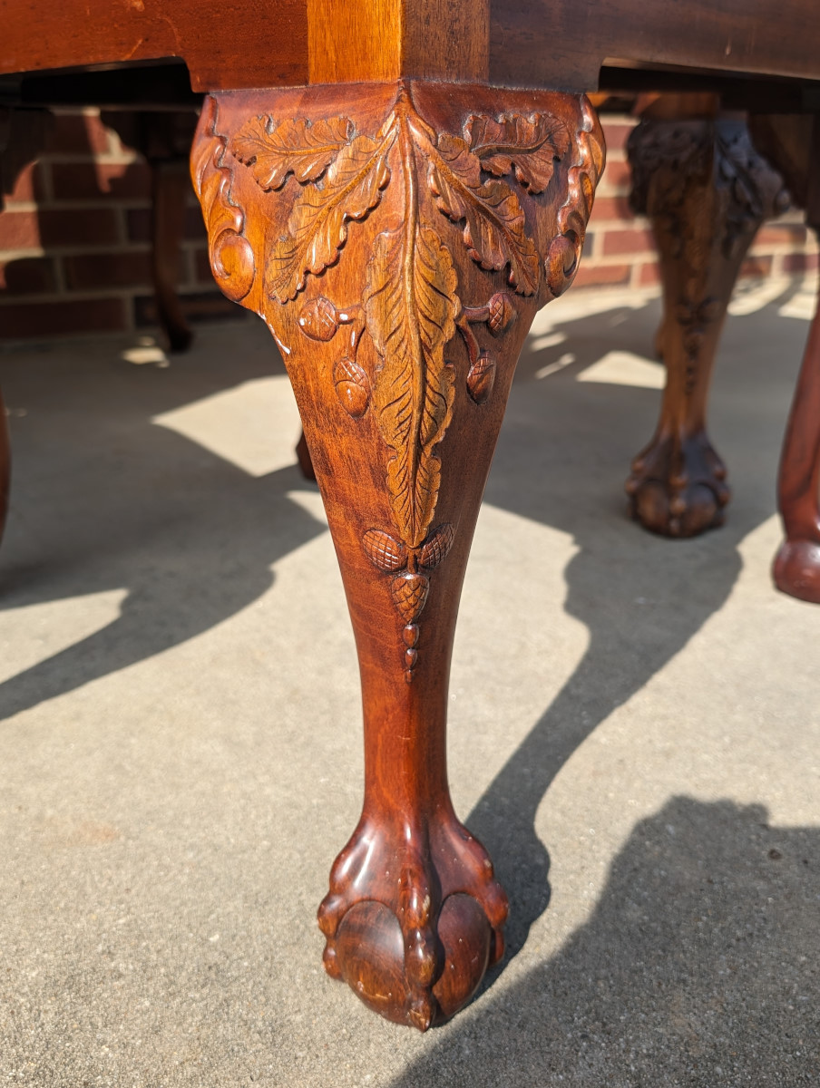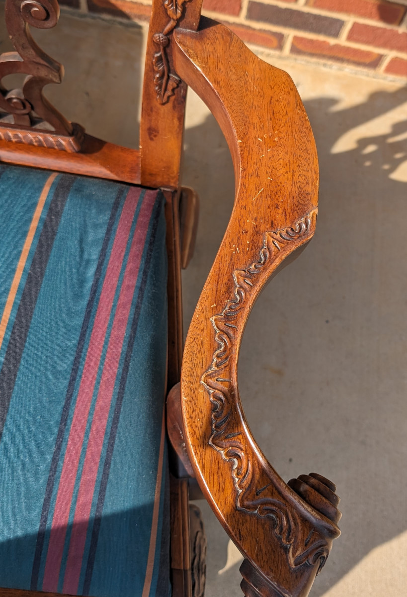 Gorgeous Chippendale style chairs, Early 20th Century, 2 Armchairs, 4 Side Chairs, Solid Mahogany frame, Heavily carved, Removable upholstered seats, Paw feet. In very good sturdy condition, minor wear, scratches and dings due to age and use, some fading of wood on a couple of chairs, Two armchairs lighter than group due to fading of wood. Measures: Armchairs 39″H x 29″W x 24″D. Seat 19″H. Arm 27″H. Side Chairs 38.5″H x 24.5″W x 21.5″D. Seat 19″H.