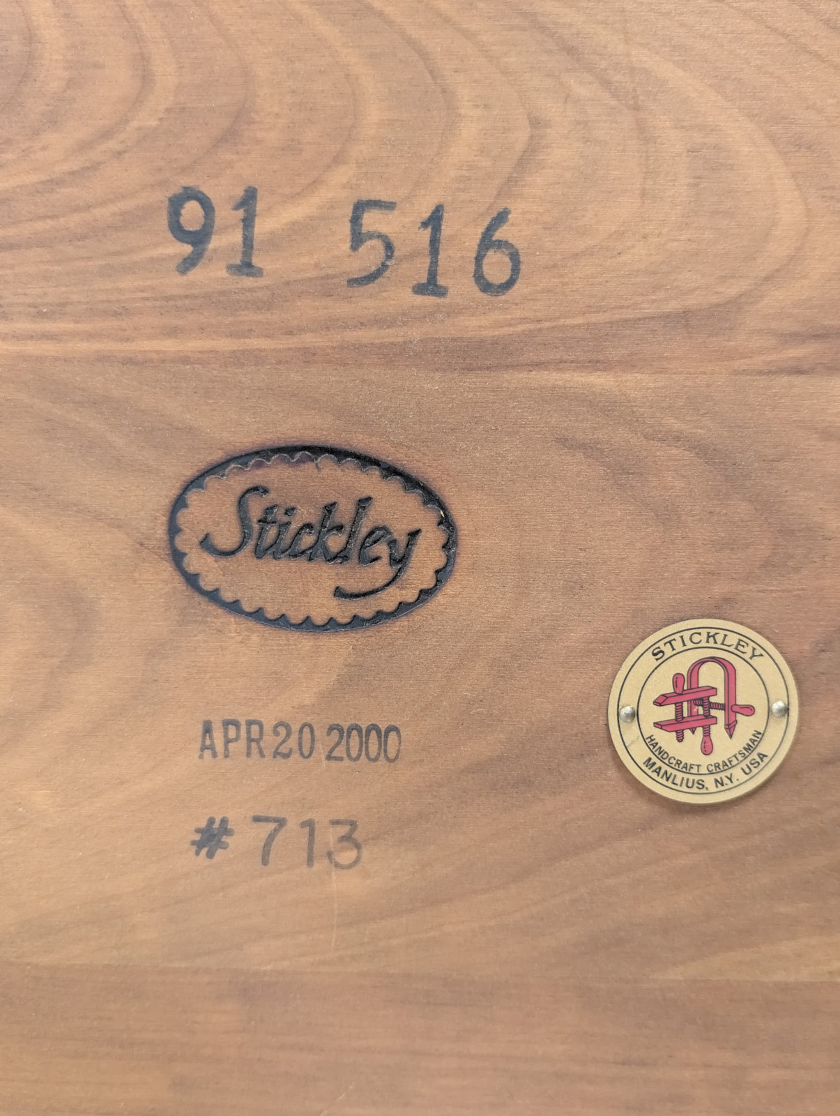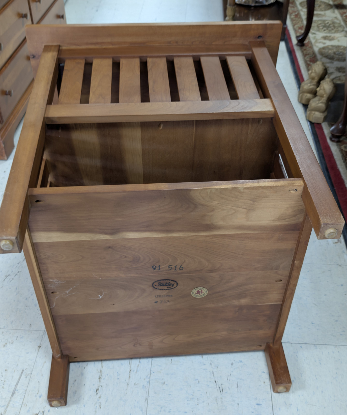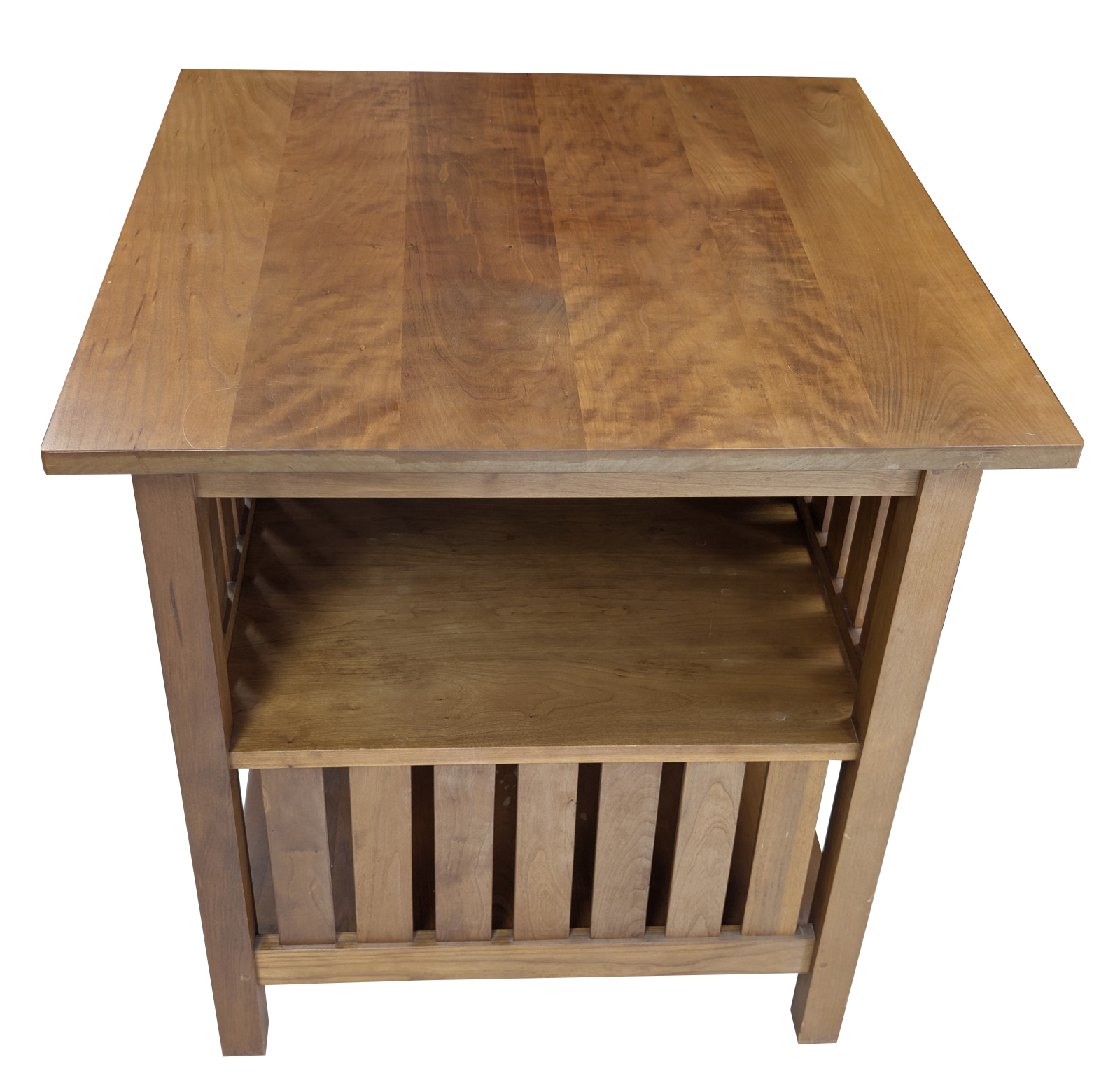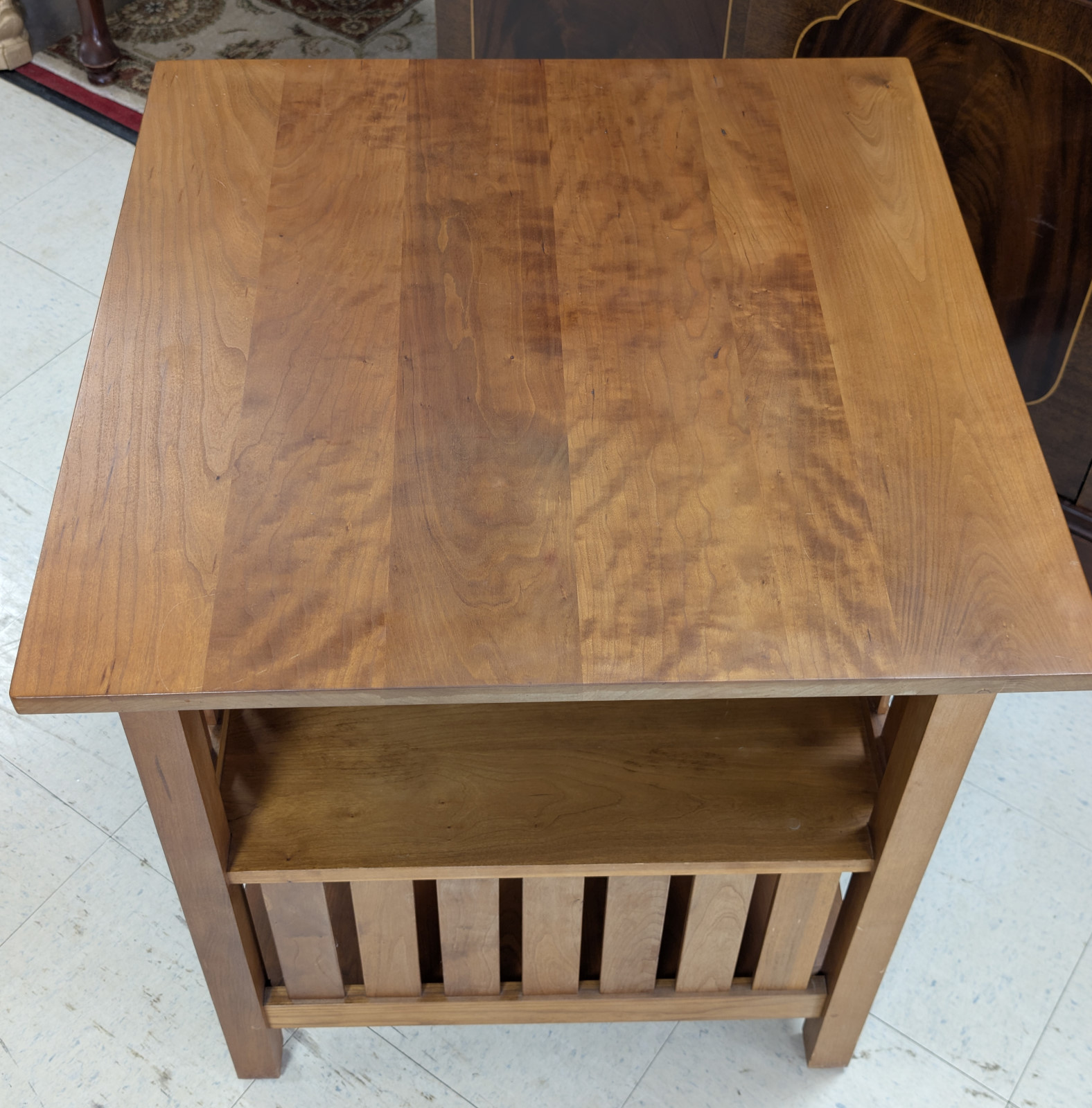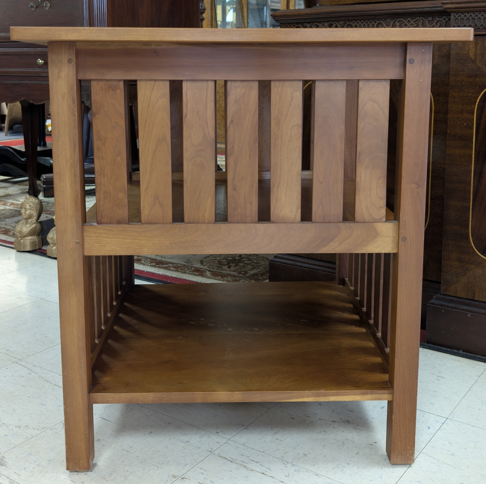 The two-tier configuration offers practical versatility, with an open upper shelf and a lower slatted compartment ideal for books, magazines, or display. The warm, hand-rubbed finish enhances the natural depth and movement of the cherry, which will continue to develop a desirable patina over time. The underside retains the Stickley script mark, branded date APR 20 2000, and the Handcraftsman Manlius, NY medallion, confirming authentic production.