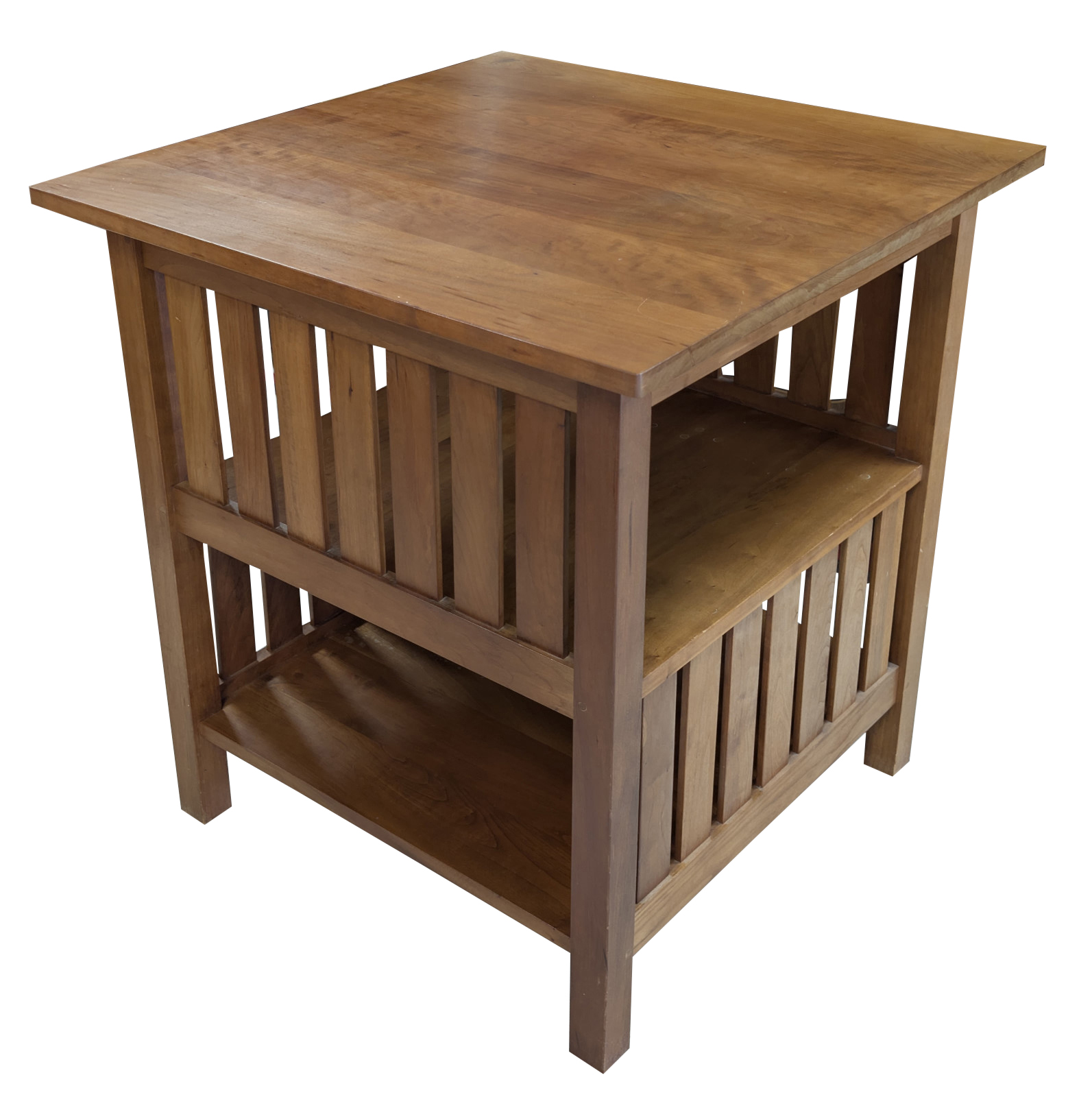 A classic expression of American Arts & Crafts design, this Stickley Mission Book Table embodies the firm’s enduring commitment to craftsmanship, proportion, and honest materials. Executed in richly figured solid cherry, the table features a broad square top with beautifully matched grain, supported by sturdy square legs and distinctive vertical slatted sides, a hallmark of Stickley’s Mission aesthetic.