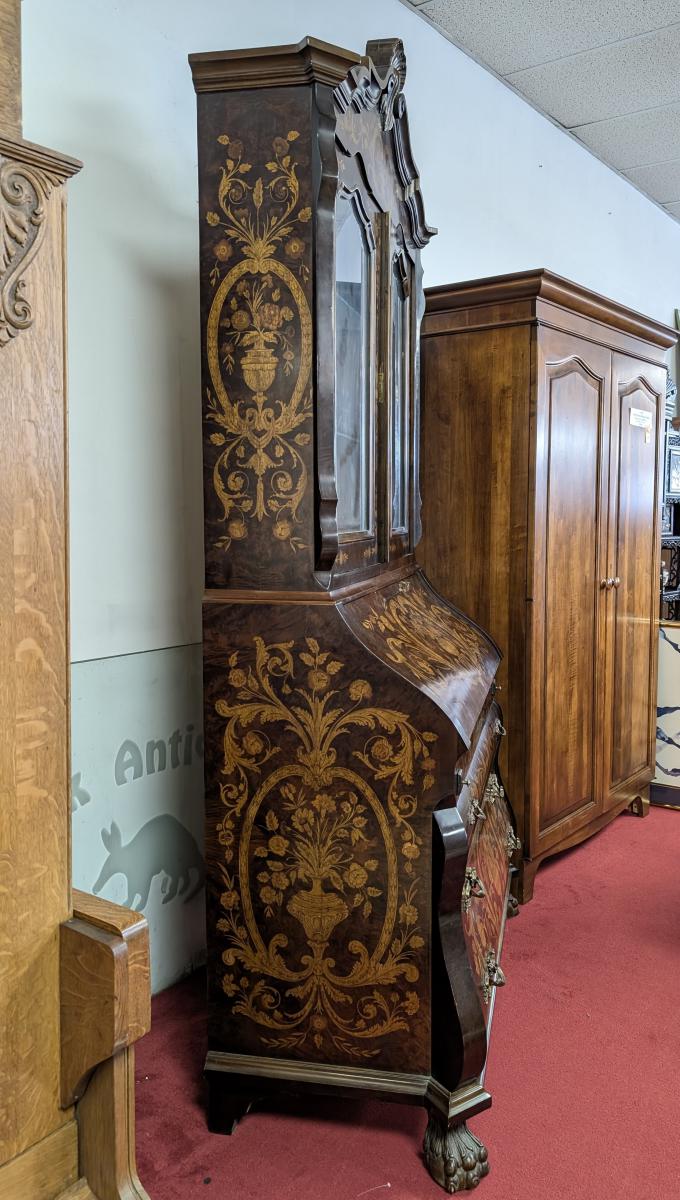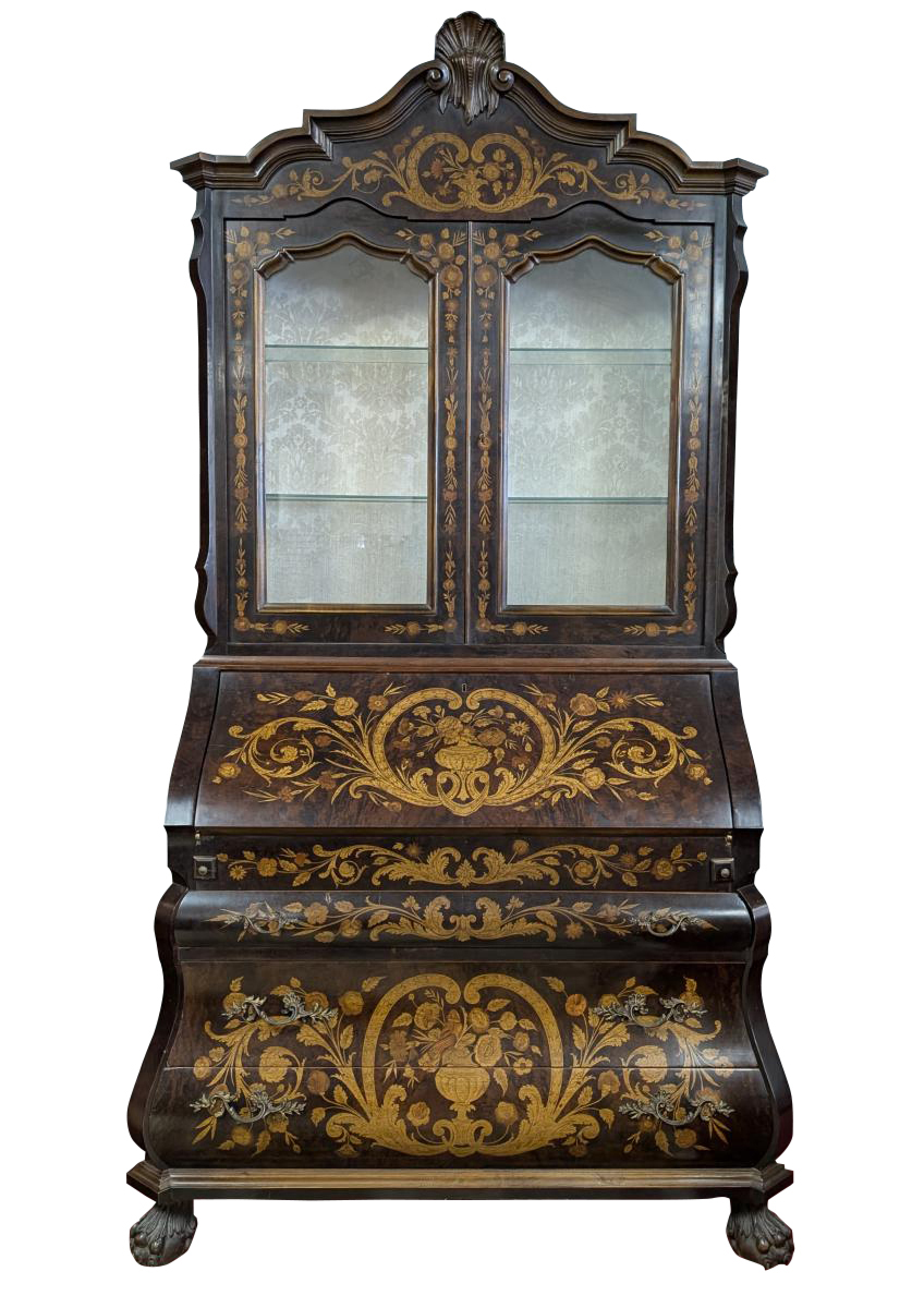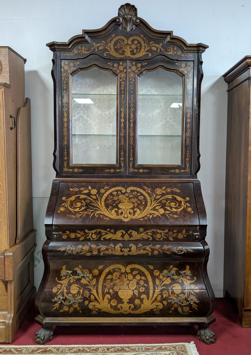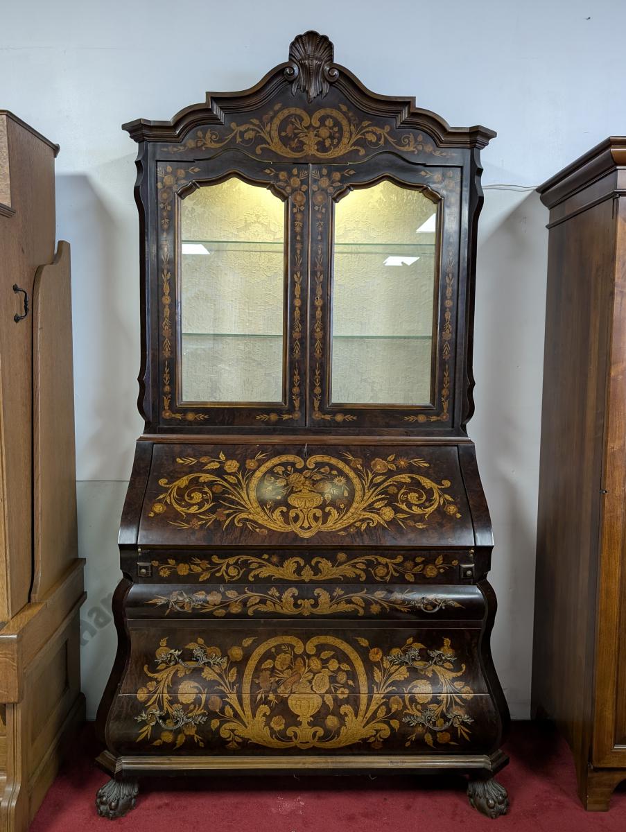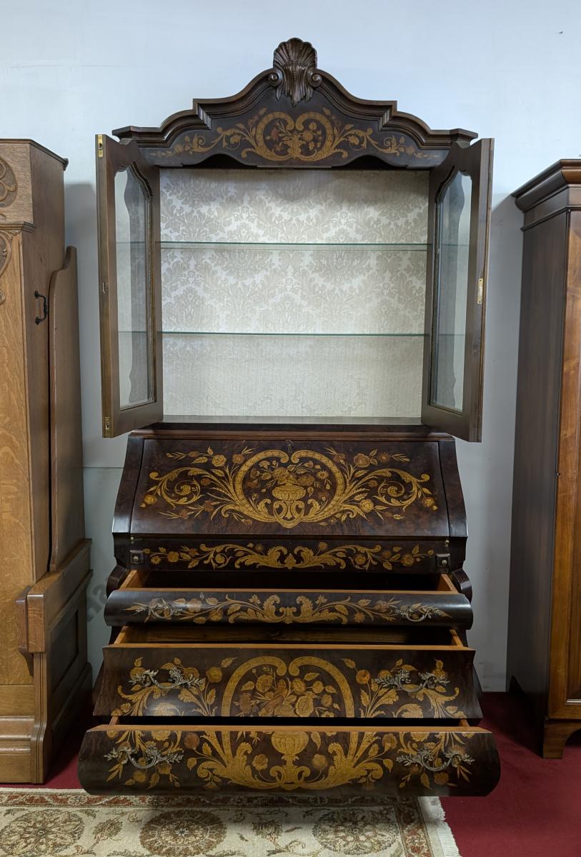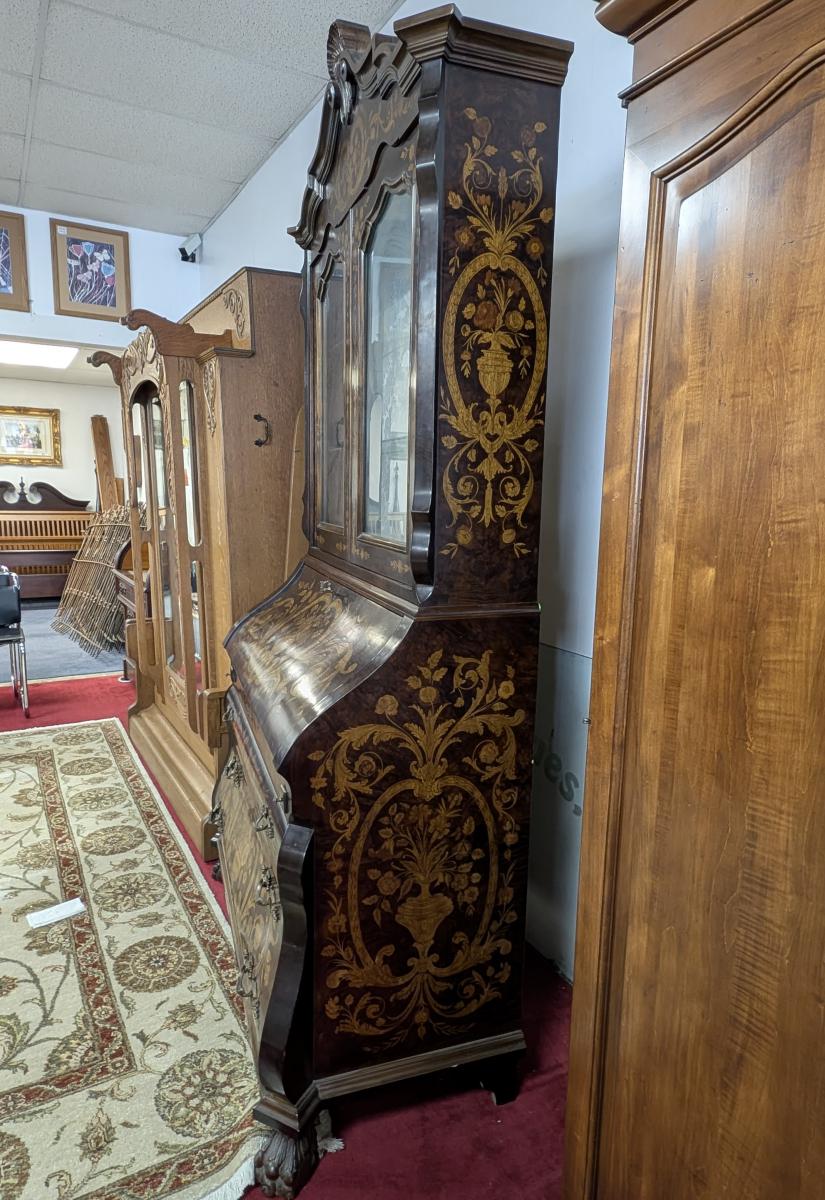 Statement piece! Solid Walnut, Inlaid on front, sides and inside desk! Carved shell design on top, Two locking glass front doors, Two removable glass shelves, Lovely texrtured fabric lining, Light in upper inside, Bottom case opens to inlaid writing surface, Pigeonholing, Two lopers, Three large lowers drawers, Rest on carved paw feet. In great, very sturdy, clean overall condition, some very minor signs of wear. Ready for any home or office. See all photos. Measures: Overall 94″H x 51″W x 23″D. Desk Writing Surface 31.5″H. Bottom case alone: 44.25″H.