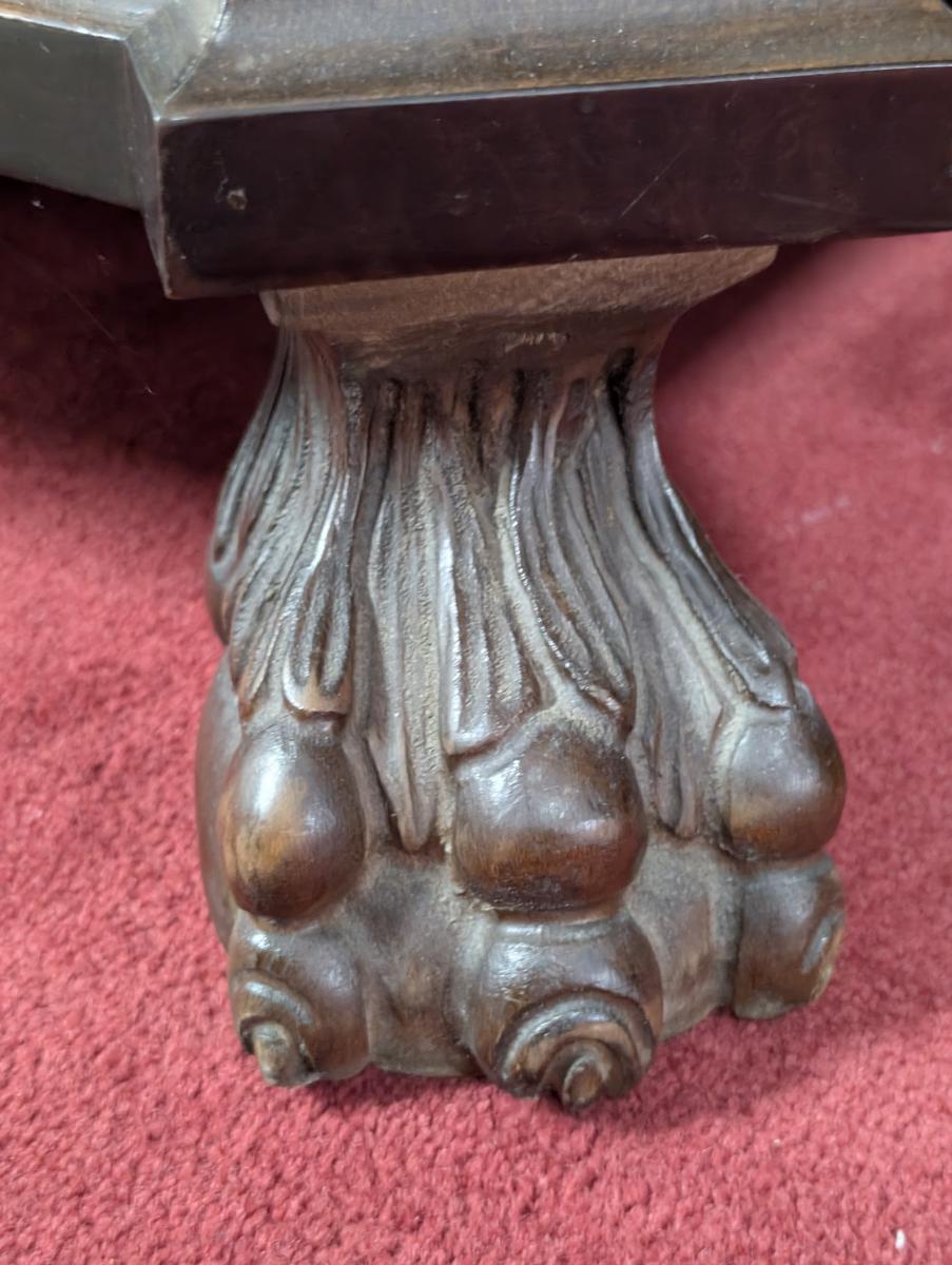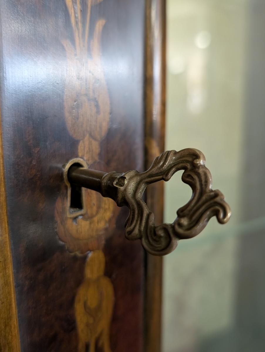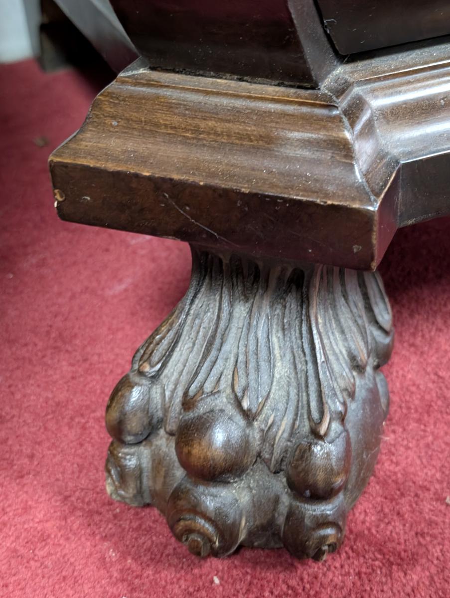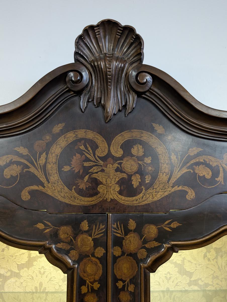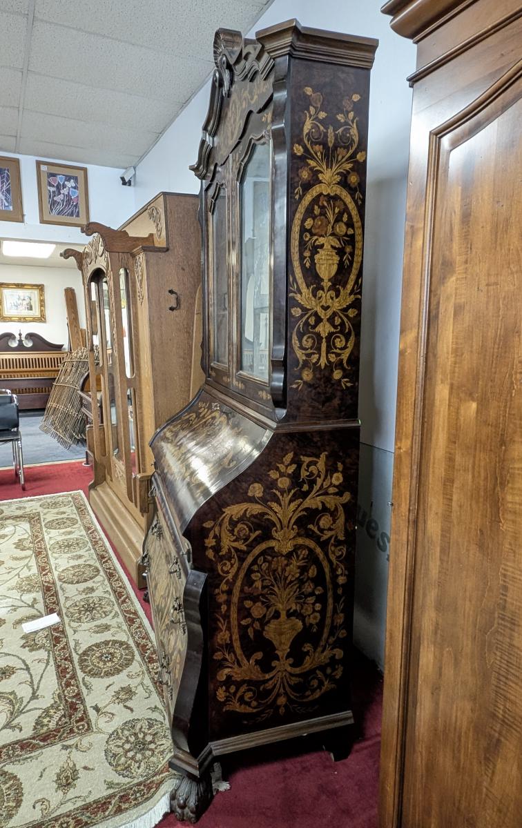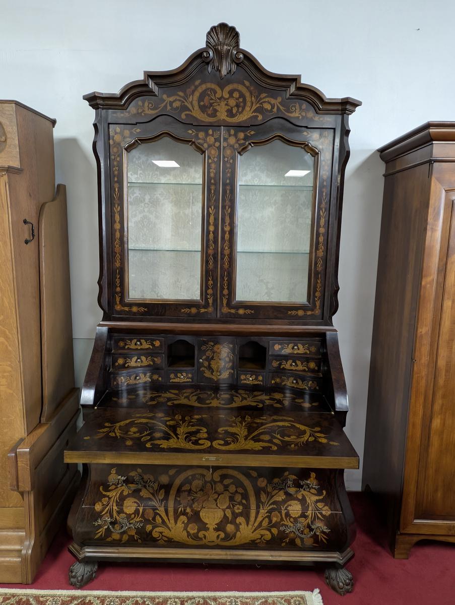 Statement piece! Solid Walnut, Inlaid on front, sides and inside desk! Carved shell design on top, Two locking glass front doors, Two removable glass shelves, Lovely texrtured fabric lining, Light in upper inside, Bottom case opens to inlaid writing surface, Pigeonholing, Two lopers, Three large lowers drawers, Rest on carved paw feet. In great, very sturdy, clean overall condition, some very minor signs of wear. Ready for any home or office. See all photos. Measures: Overall 94″H x 51″W x 23″D. Desk Writing Surface 31.5″H. Bottom case alone: 44.25″H.