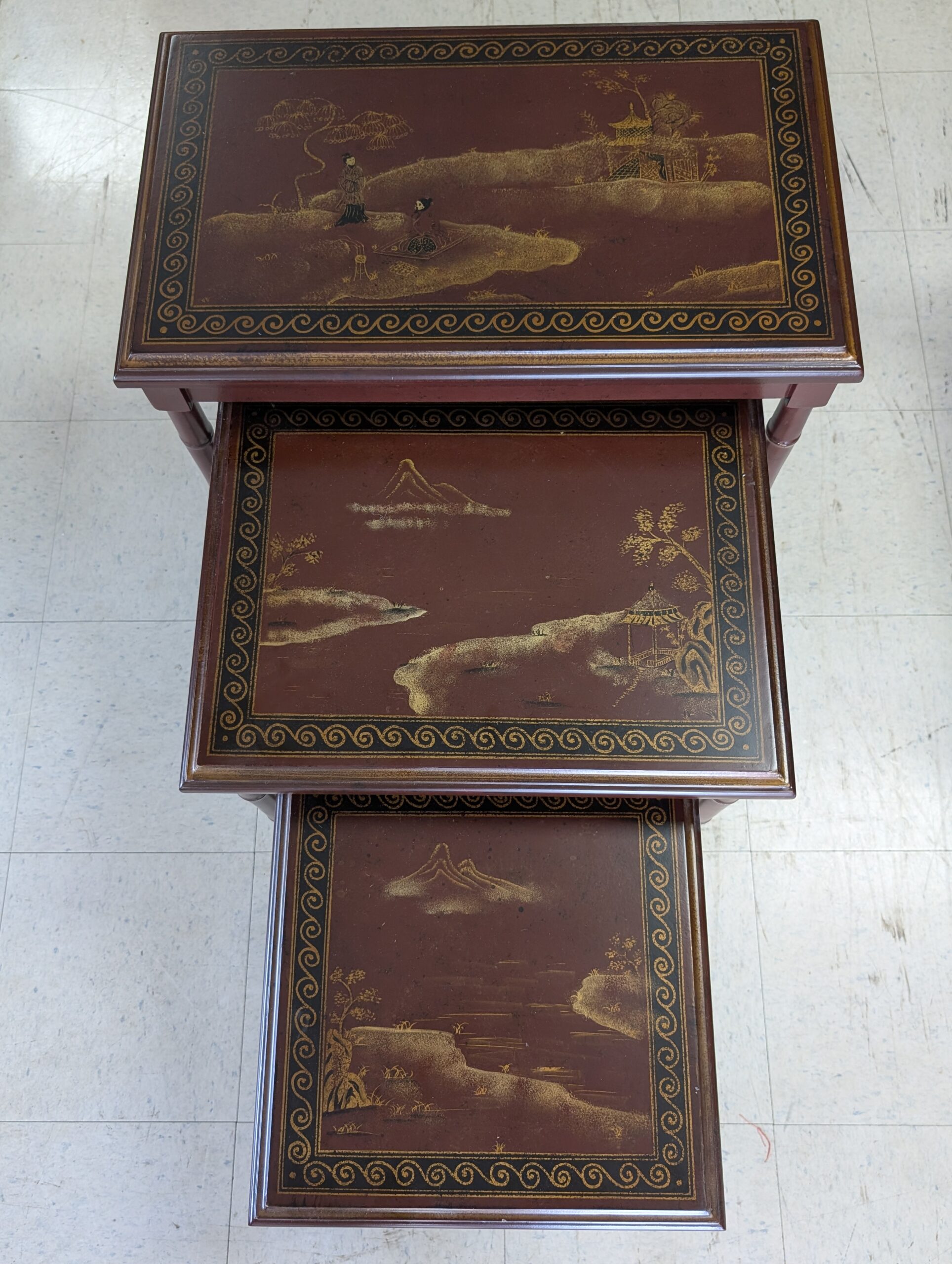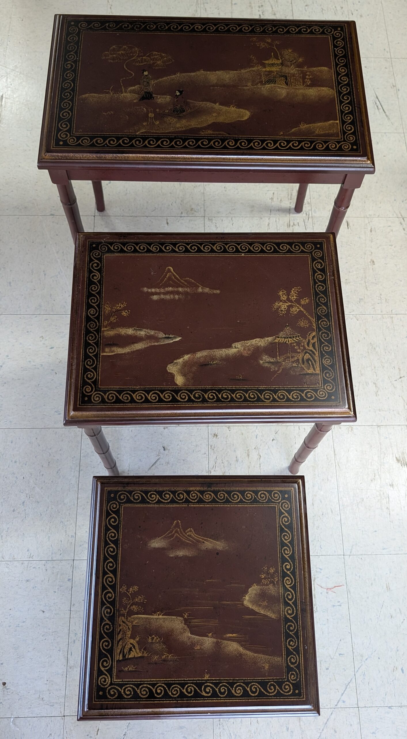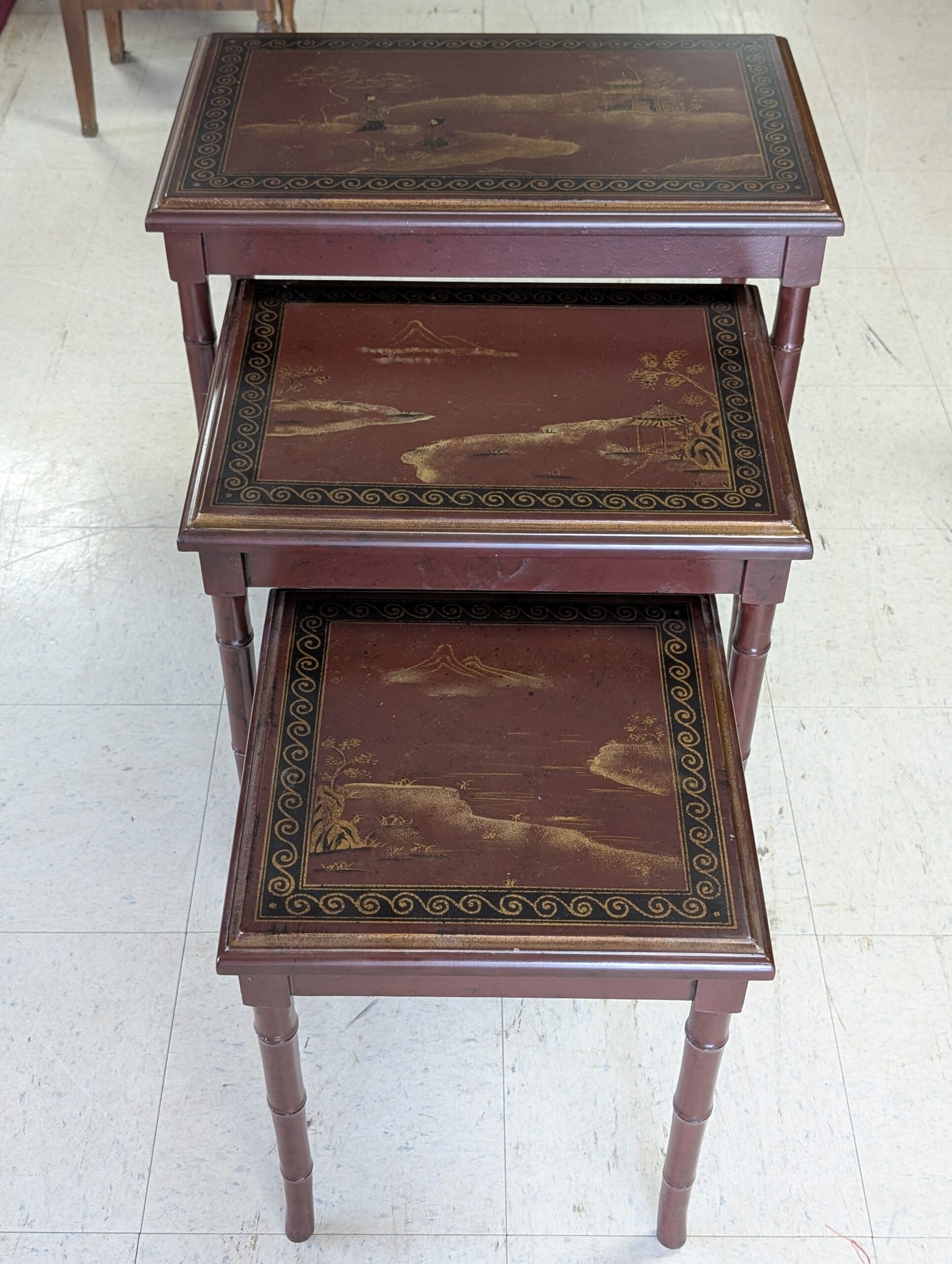 Nesting Tables, Set of 3 tables, Graduated heights, Deep reddish color, Asian style gold painted scenes on each table, Bamboo look legs. In great overall condition, expected age wear, some scratches. See all photos for condition. Measurements: 24.5″H x 23.25″W x 14.25″D ~ 21″H x 18.75″W x 14.25″D ~ 17.5″H x 14.25″W x 14.25″D