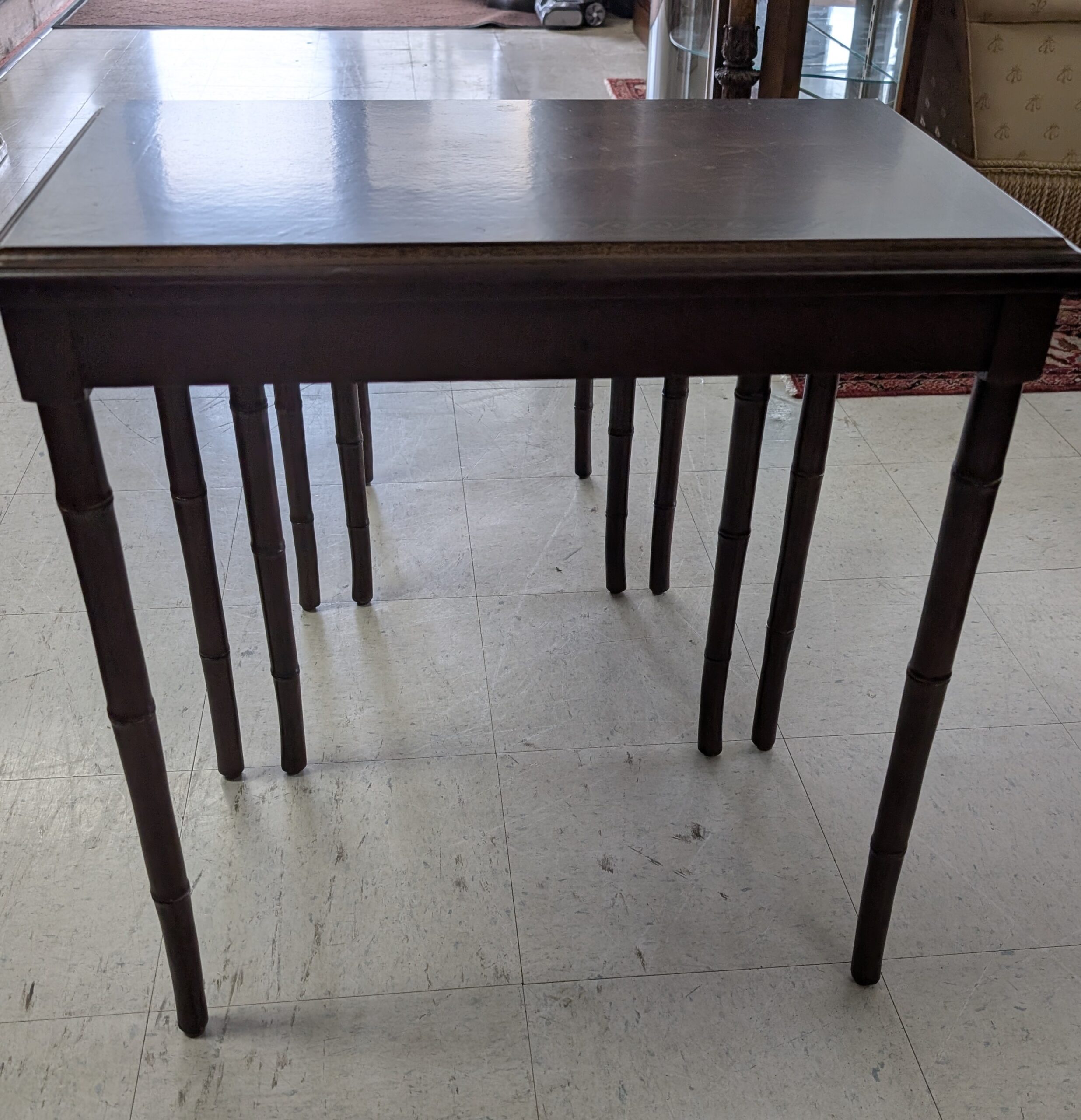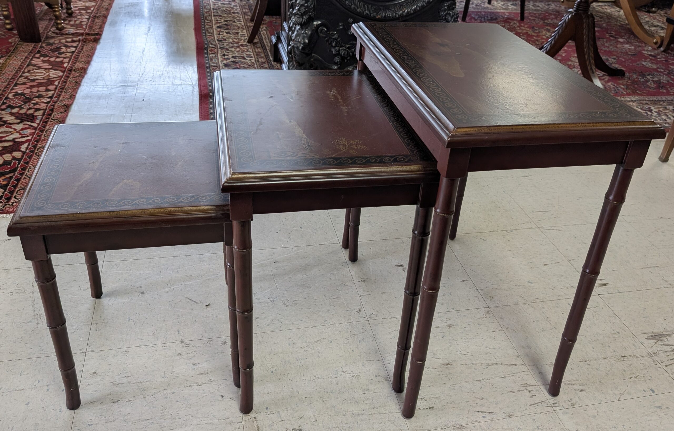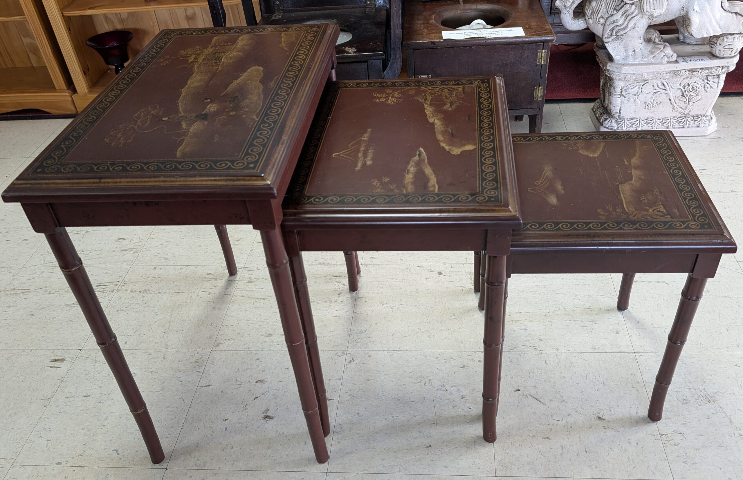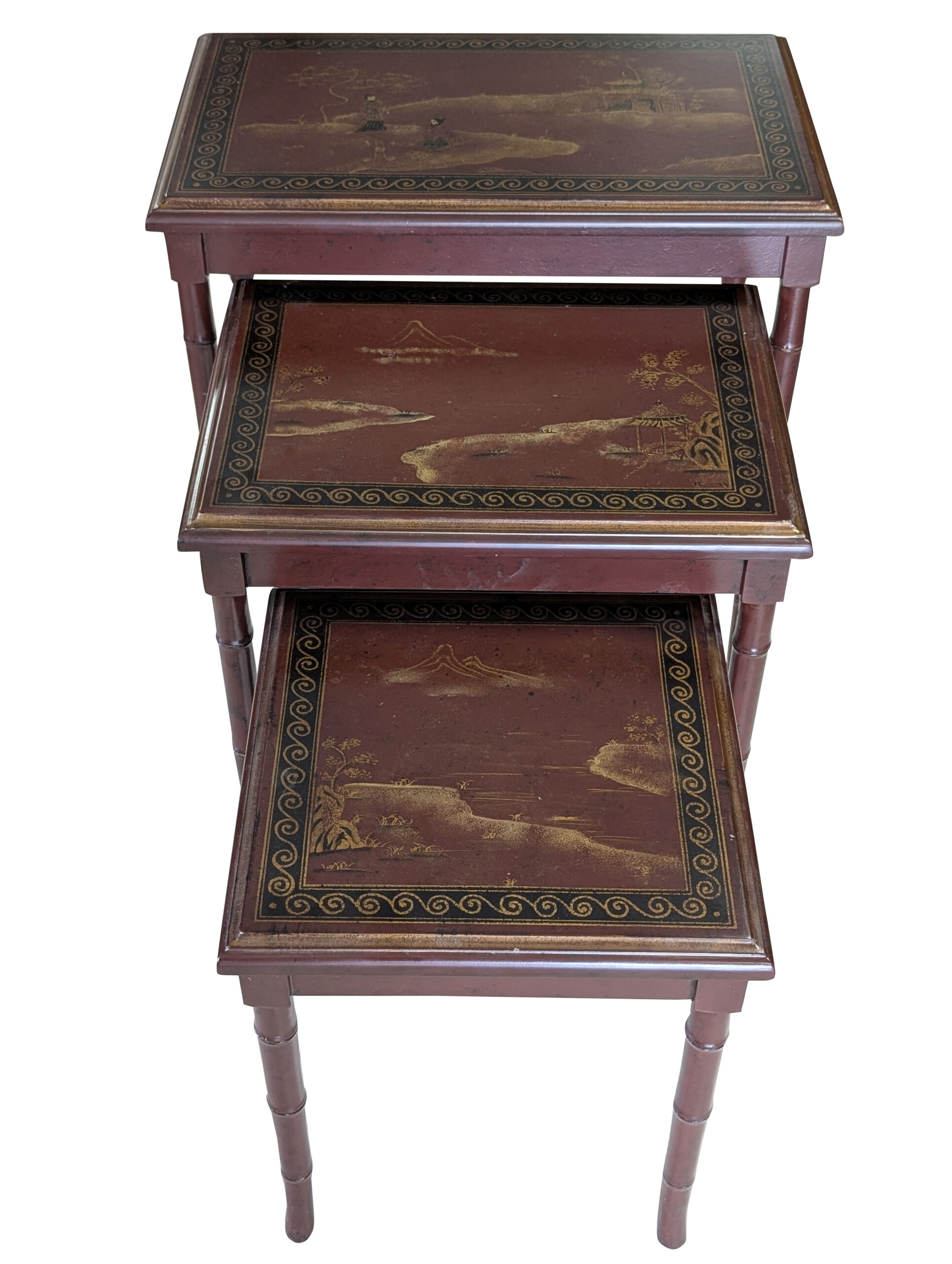 Nesting Tables, Set of 3 tables, Graduated heights, Deep reddish color, Asian style gold painted scenes on each table, Bamboo look legs. In great overall condition, expected age wear, some scratches. See all photos for condition. Measurements: 24.5″H x 23.25″W x 14.25″D ~ 21″H x 18.75″W x 14.25″D ~ 17.5″H x 14.25″W x 14.25″D