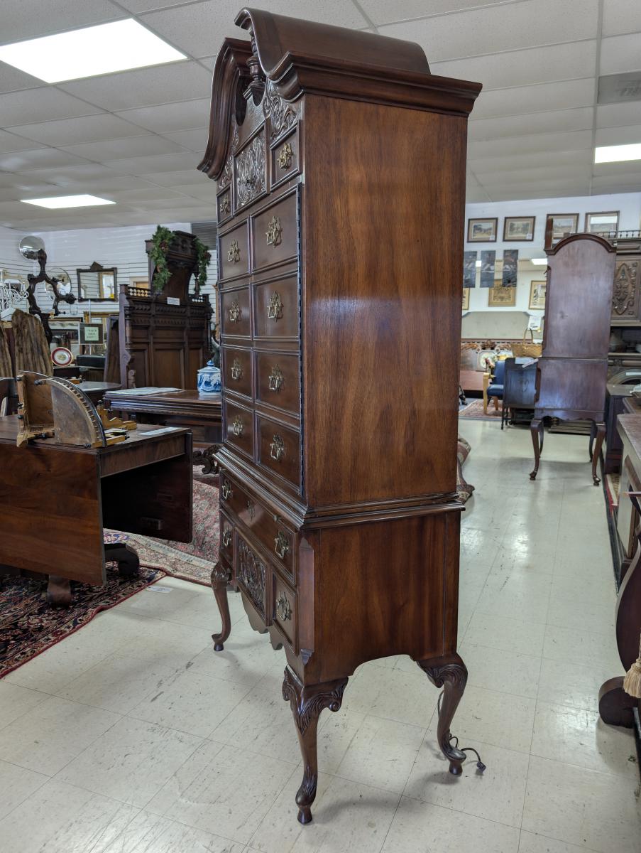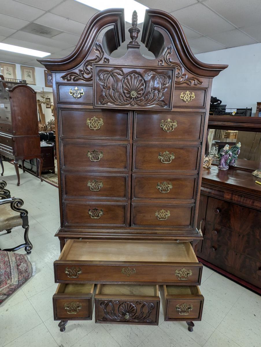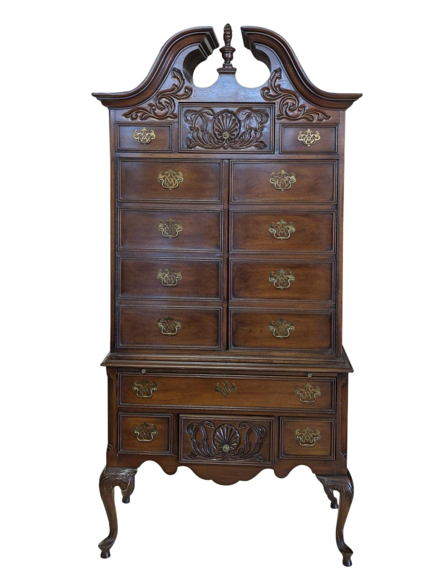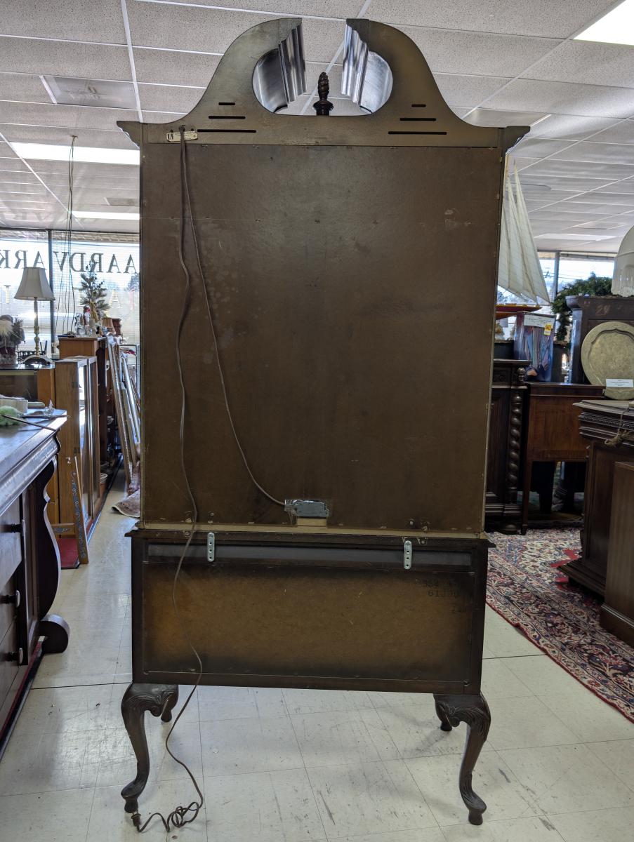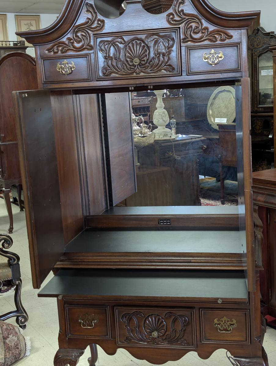 Vintage, Bernhardt, Hibriten Division, Mahogany, Chippendale Style, Media Cupboard, Bar, Top has an interrupted pedeiment, Center finial, Top center drawer, 2 Faux drawer front doors open to mirror back, Lighted storage and an electrical outlet, Bottom has pull out surface, 4 dovetailed drawers, Entire piece rest on queen anne style legs with carved knees. Overall good condition, signs of wear, some damage to either side (see all photos). Measures: 81″H x 39″W x 20″D. Inside 29″ x 33.5″.