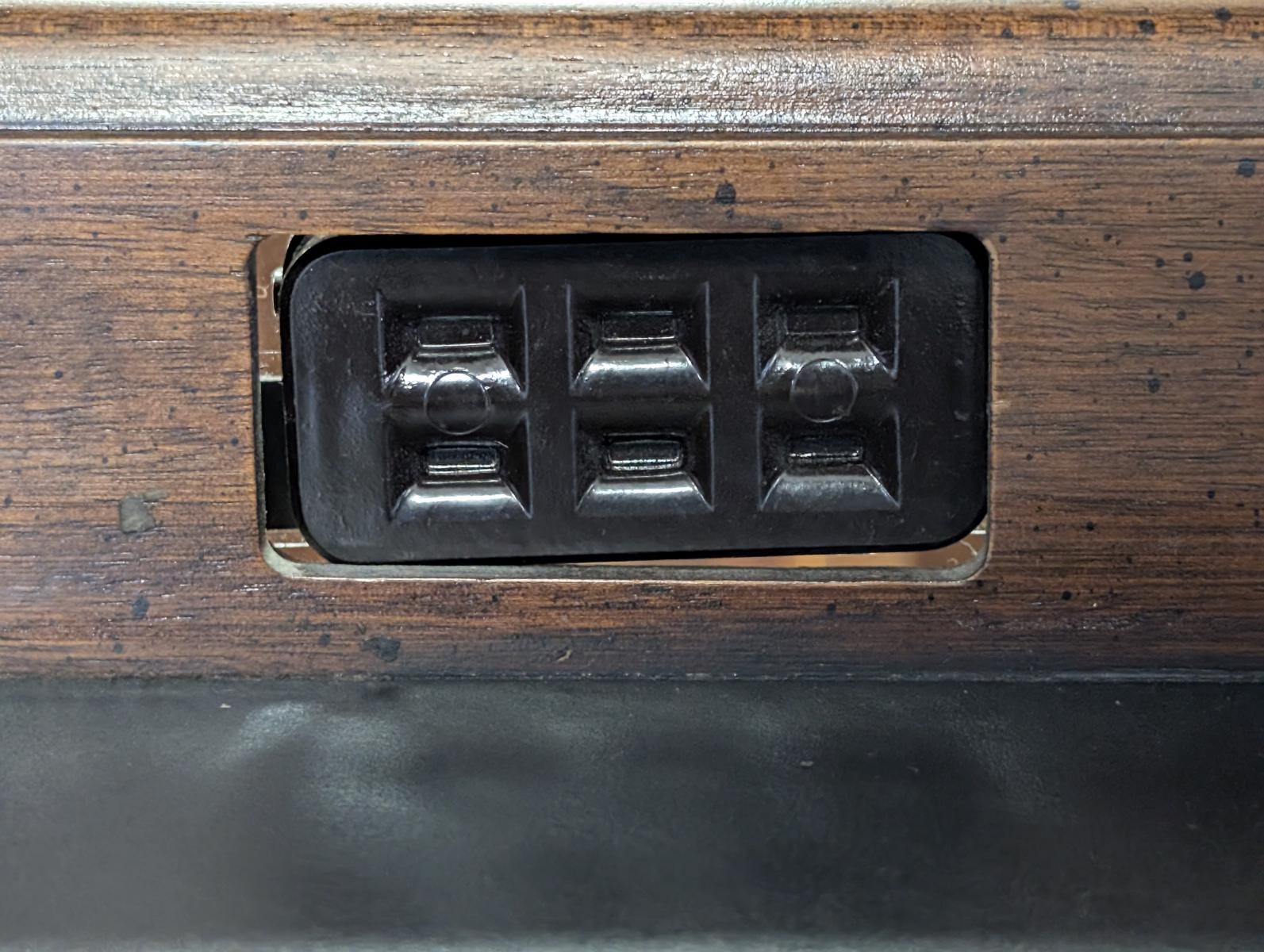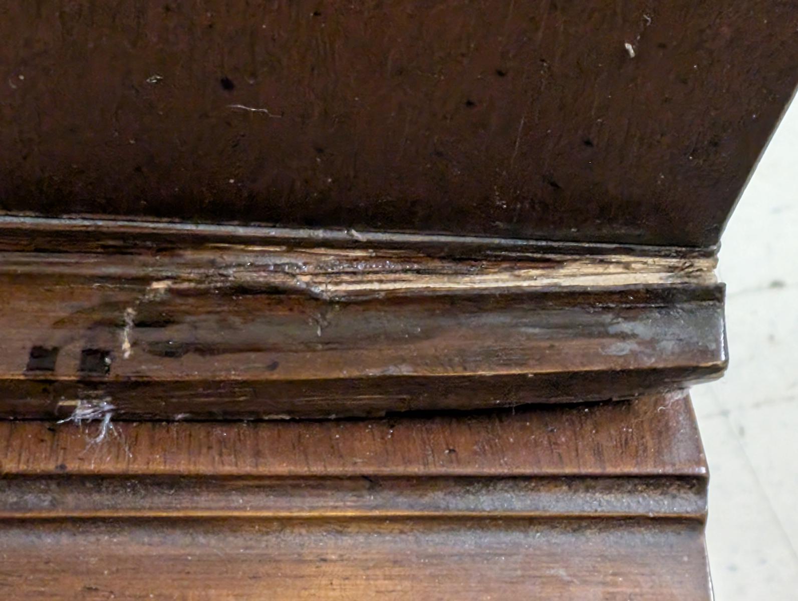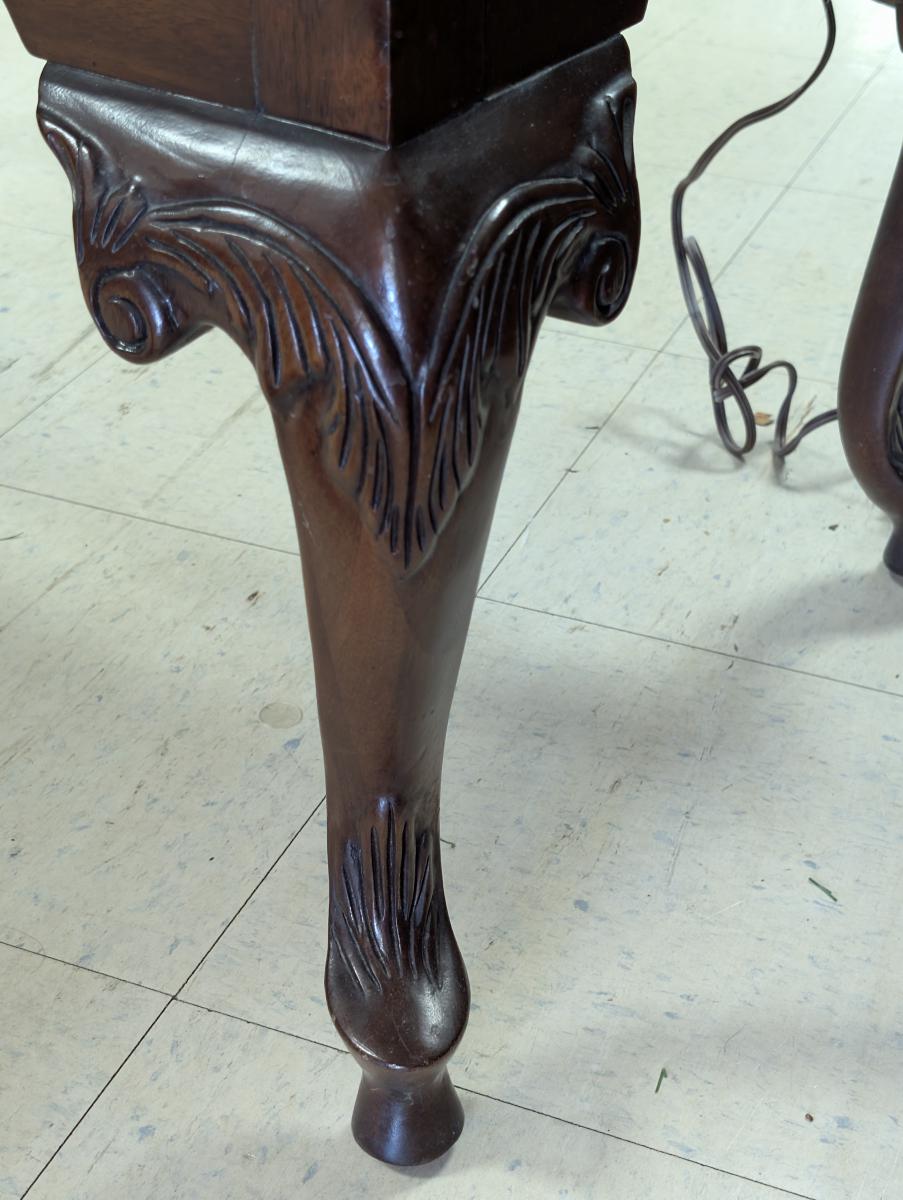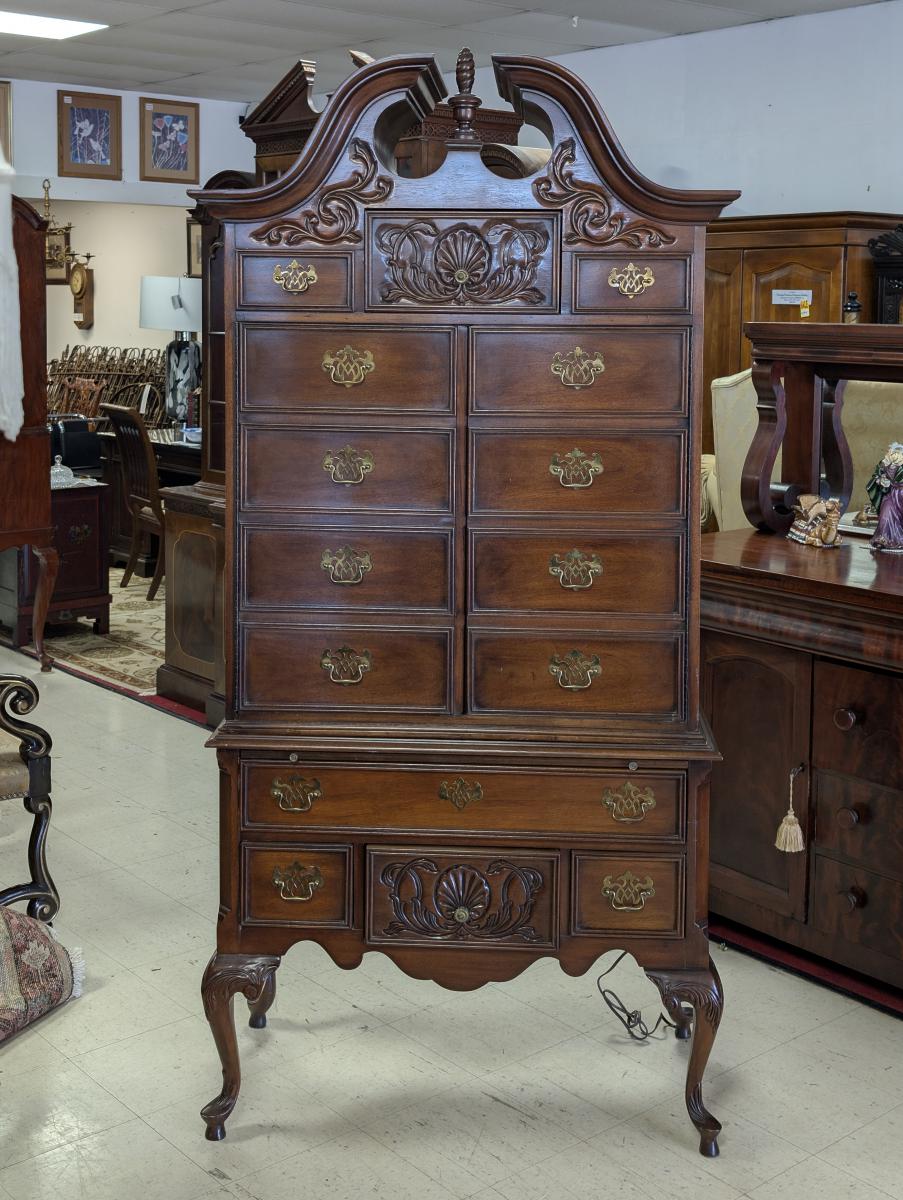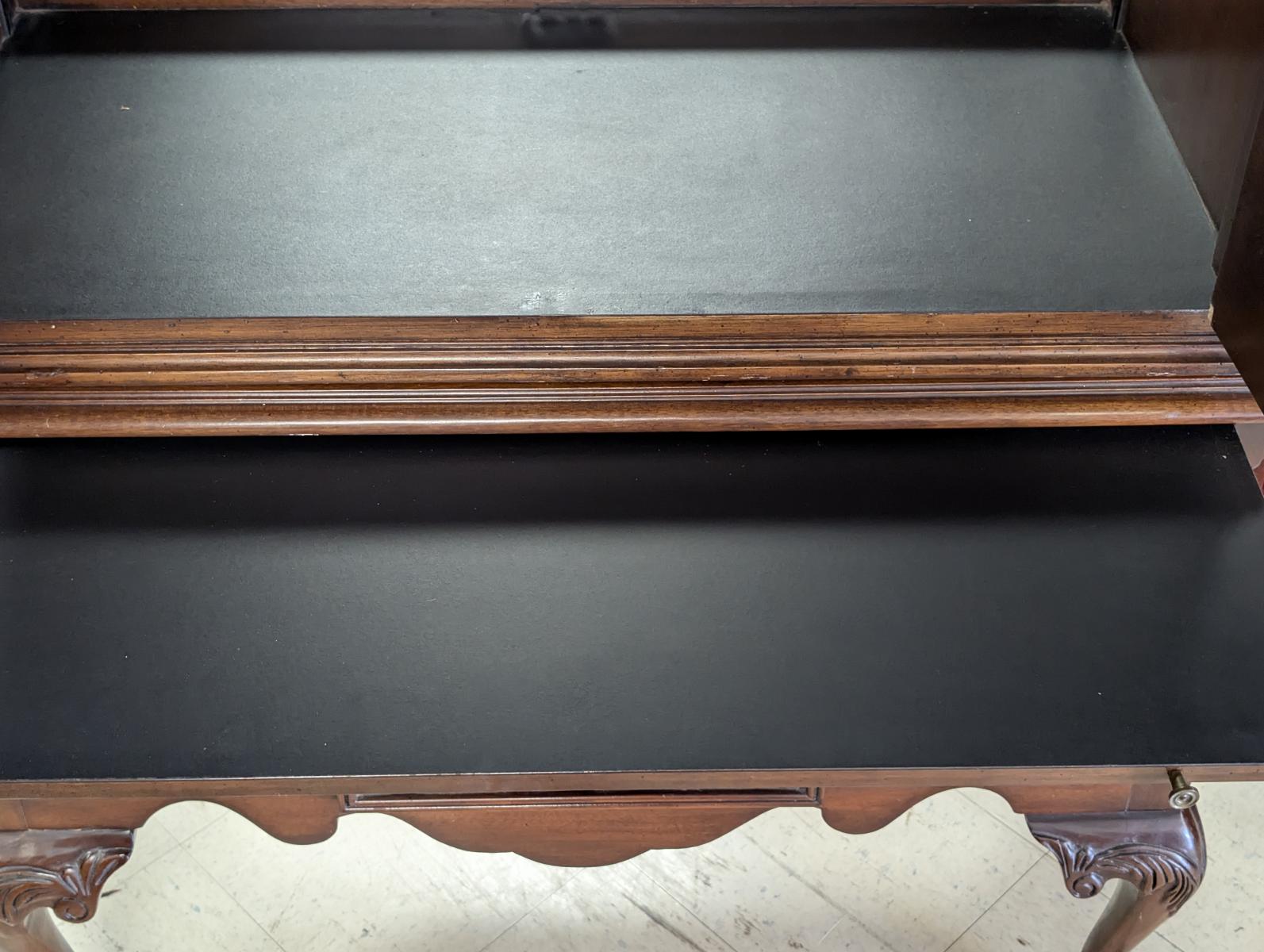 Vintage, Bernhardt, Hibriten Division, Mahogany, Chippendale Style, Media Cupboard, Bar, Top has an interrupted pedeiment, Center finial, Top center drawer, 2 Faux drawer front doors open to mirror back, Lighted storage and an electrical outlet, Bottom has pull out surface, 4 dovetailed drawers, Entire piece rest on queen anne style legs with carved knees. Overall good condition, signs of wear, some damage to either side (see all photos). Measures: 81″H x 39″W x 20″D. Inside 29″ x 33.5″.