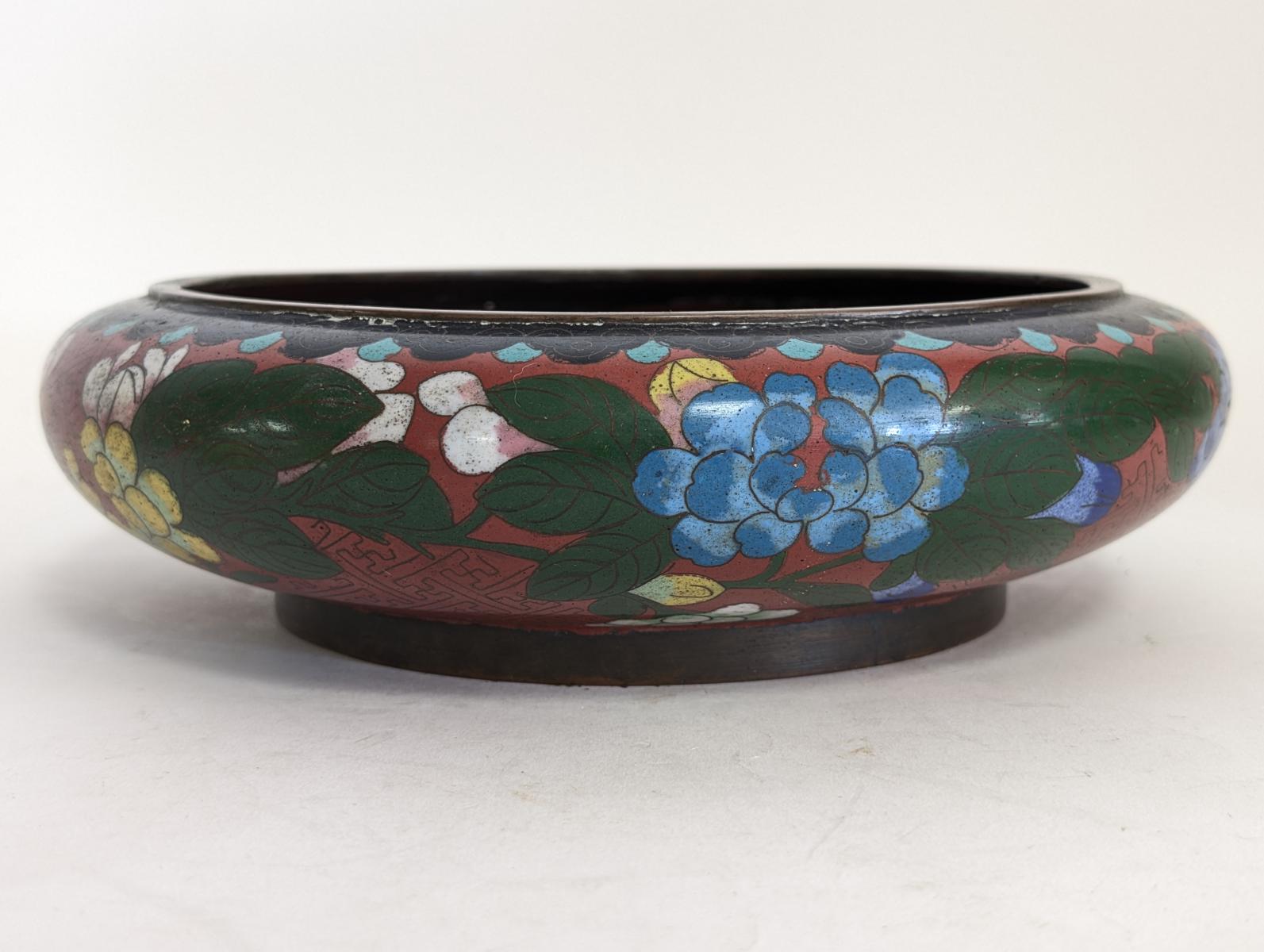 | FEATURES: | Vintage Chinese Cloisonne Low Bowl, Lotus Flower, 9.75"Diameter |