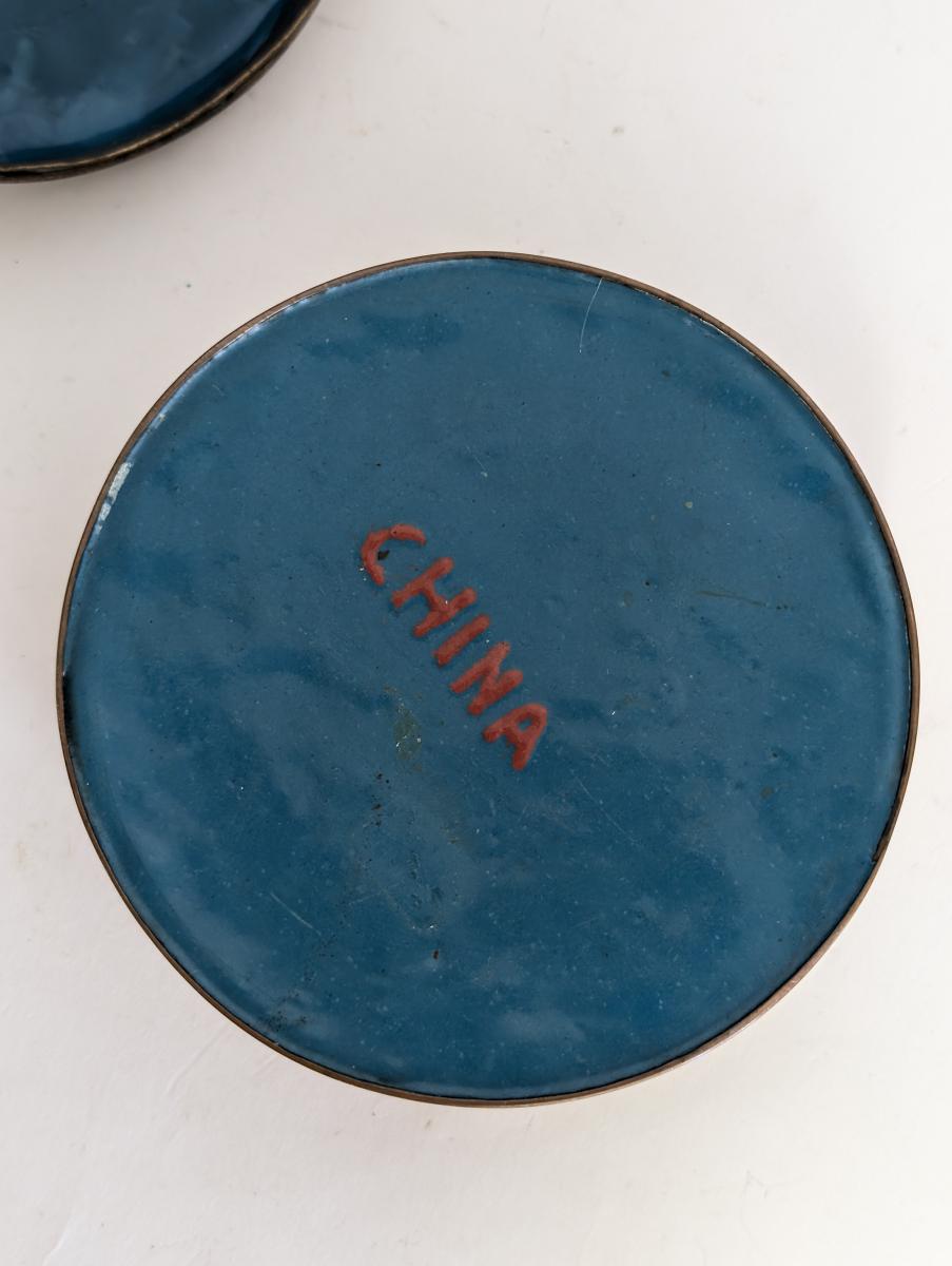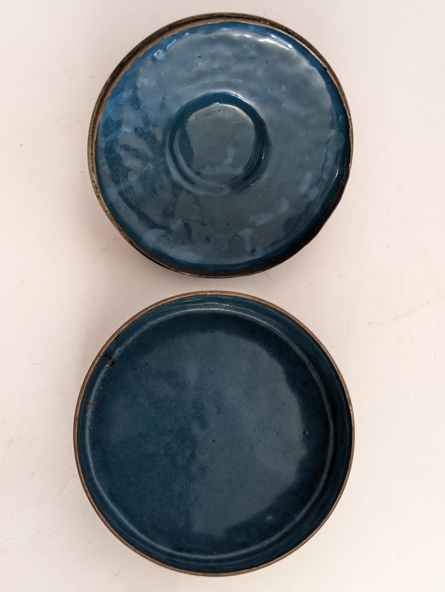 Vintage, Cloisonne Lidded Box, Cloissone, Foo Dog, Round Trinket Box, Black Background, Floral and swirls, Brass and enamel, Inside box is a vivid blue color enamel finish. Very good condition, expected age wear, see all photos for condition. Measures: 4″H x 5.25″ Diameter w/lid. 1.75″H x w/out lid. Shipping within US $19.95. No shipping outside the US.