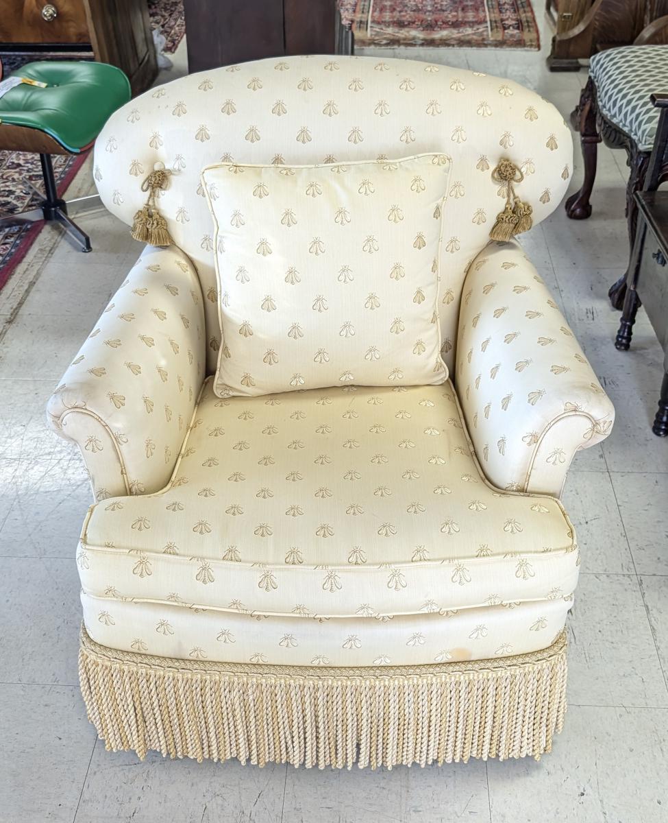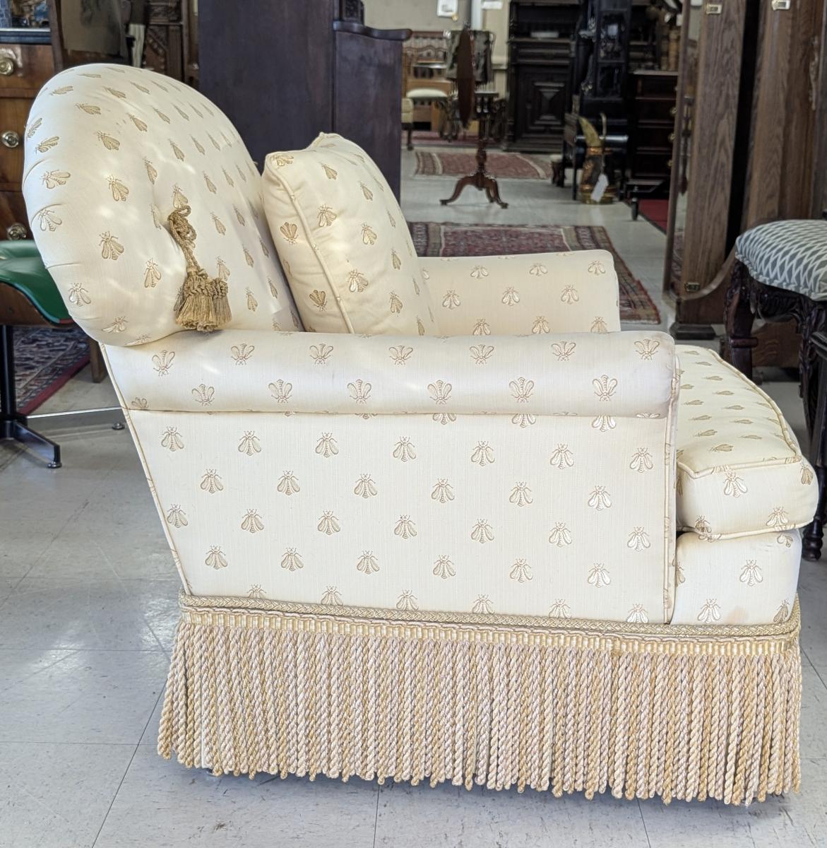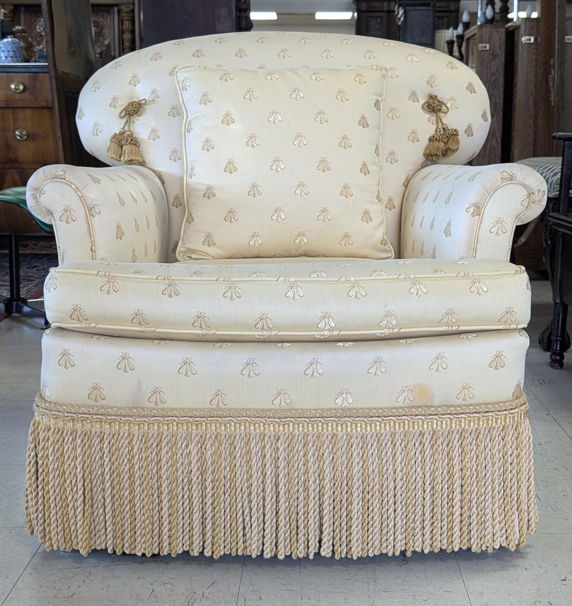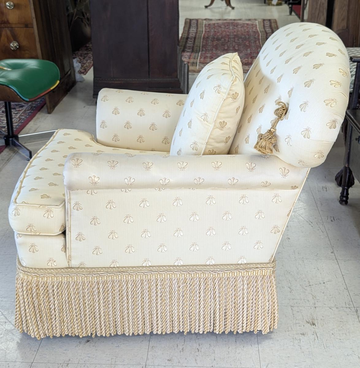 Lovely, Cushioned back, Removable seat cushion, Butter yellow bumblebee print upholstery, Matching accent pillow, Tassel accents, Rope fringe trim around the bottom, very comfortable. In very good condition, some staining in various areas. Measures: 32″H x 34″W x 33″D. Arm 22.5″H. Seat 16.5″H x 18″W x 23.5″D. We have 2 of these chairs available. Price is for one. We also have a matching sofa available. See last photo.