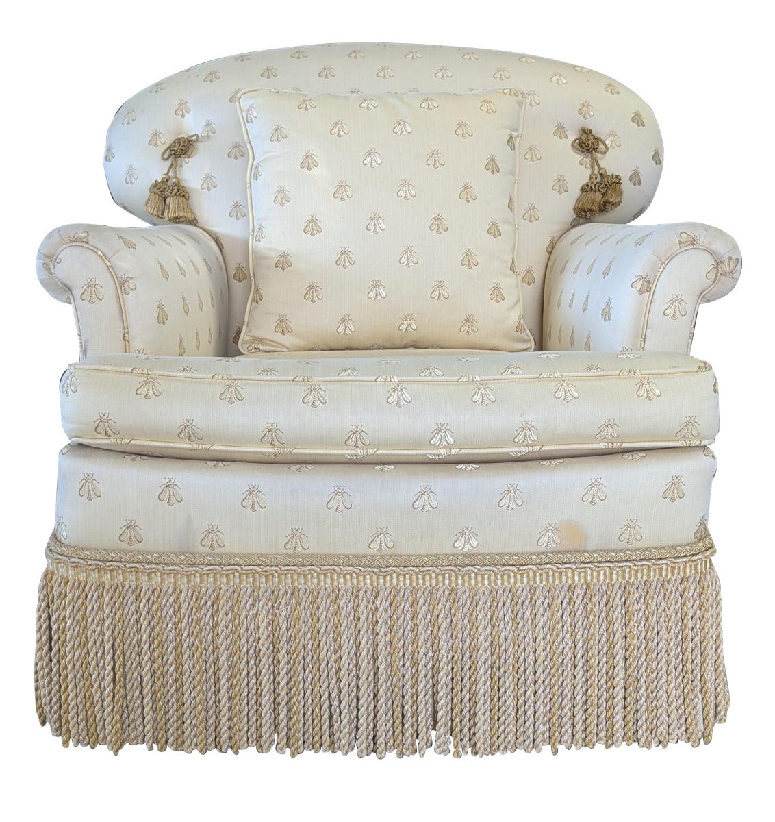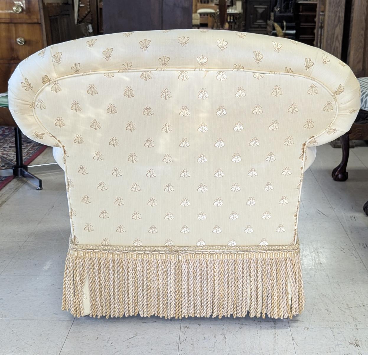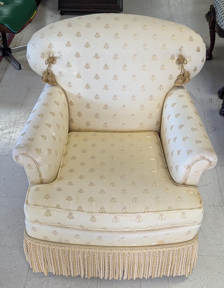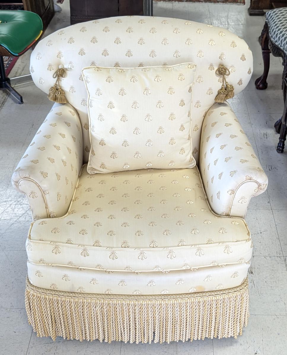 Lovely, Cushioned back, Removable seat cushion, Butter yellow bumblebee print upholstery, Matching accent pillow, Tassel accents, Rope fringe trim around the bottom, very comfortable. In very good condition, some staining in various areas. Measures: 32″H x 34″W x 33″D. Arm 22.5″H. Seat 16.5″H x 18″W x 23.5″D. We have 2 of these chairs available. Price is for one. We also have a matching sofa available. See last photo.