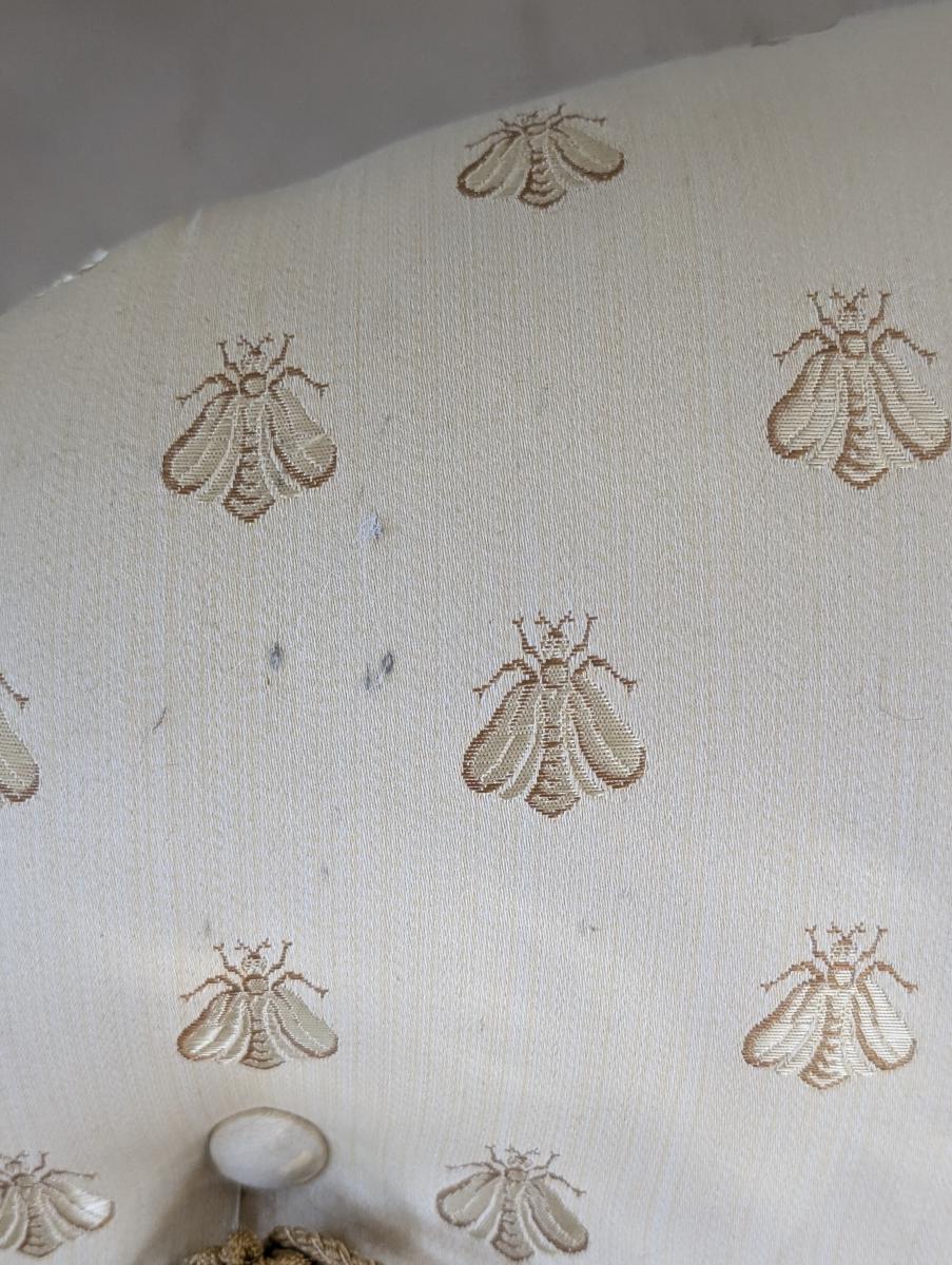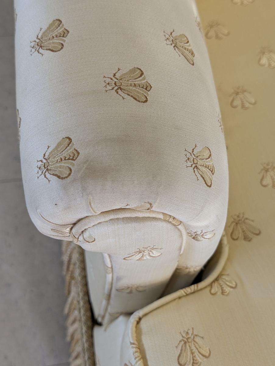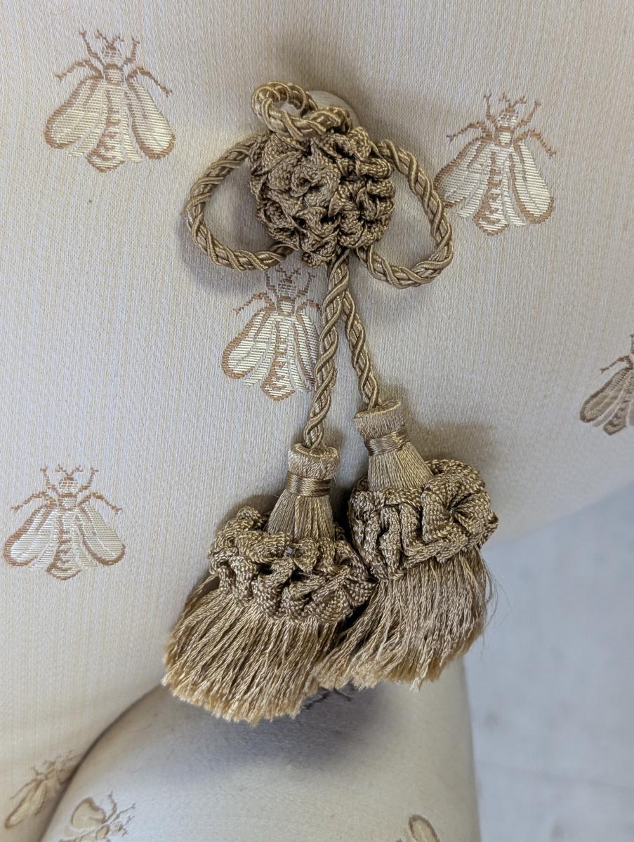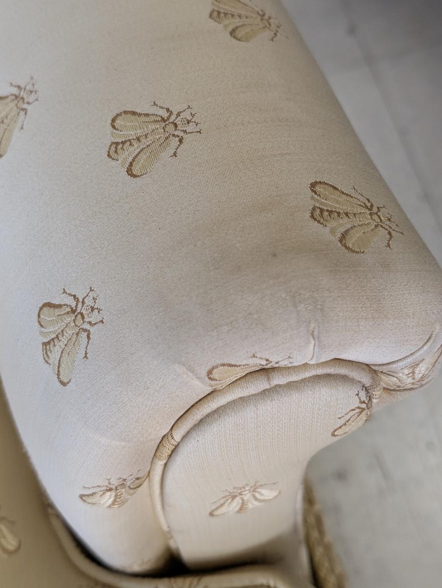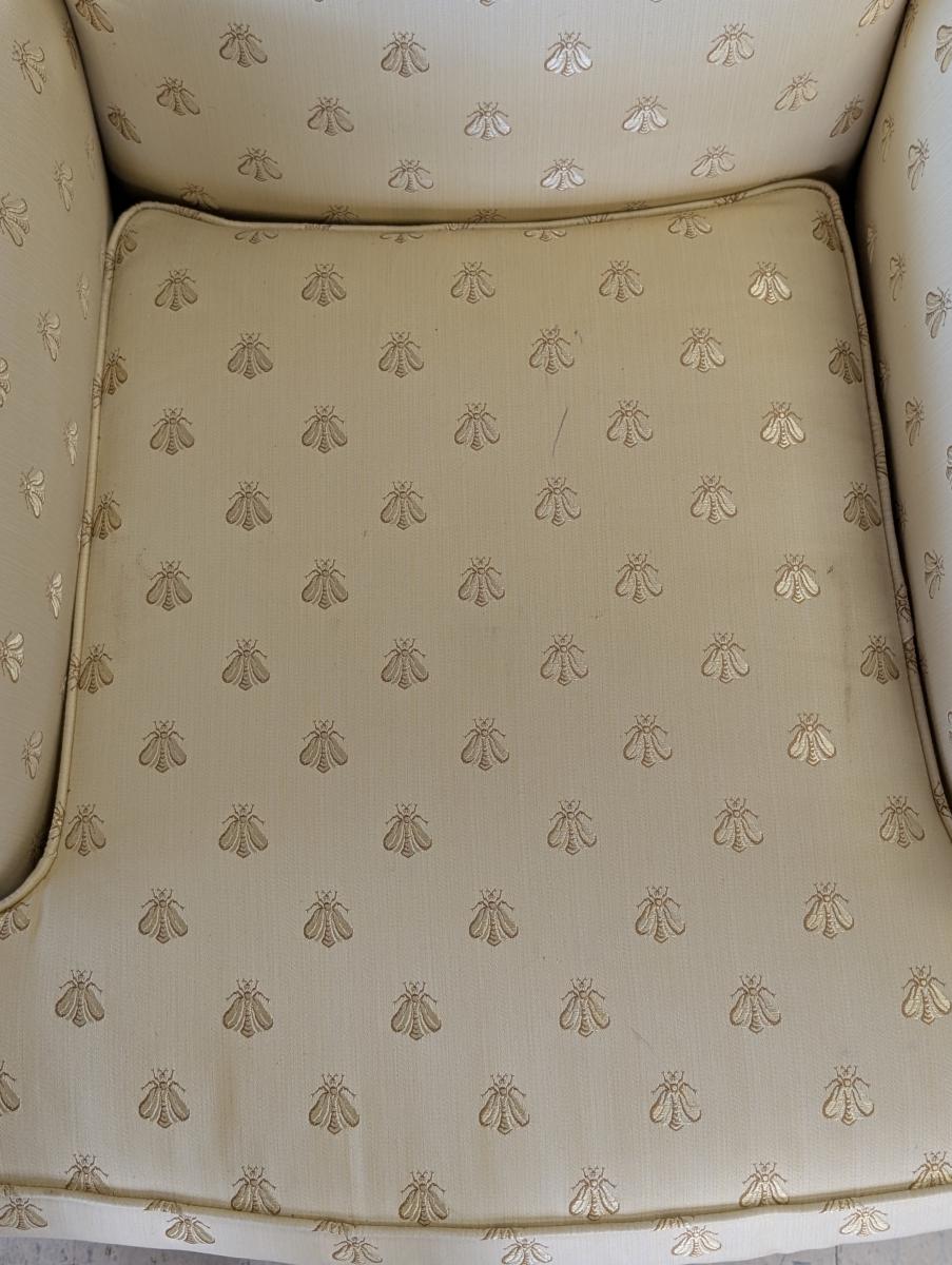 Lovely, Cushioned back, Removable seat cushion, Butter yellow bumblebee print upholstery, Matching accent pillow, Tassel accents, Rope fringe trim around the bottom, very comfortable. In very good condition, some staining in various areas. Measures: 32″H x 34″W x 33″D. Arm 22.5″H. Seat 16.5″H x 18″W x 23.5″D. We have 2 of these chairs available. Price is for one. We also have a matching sofa available. See last photo.