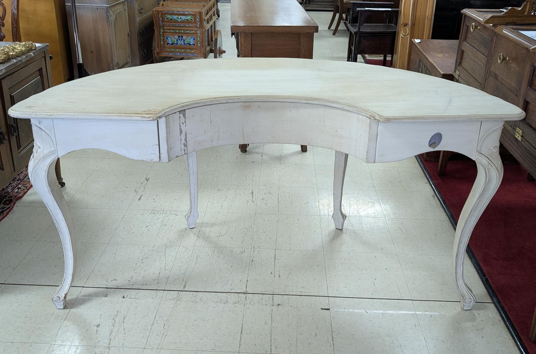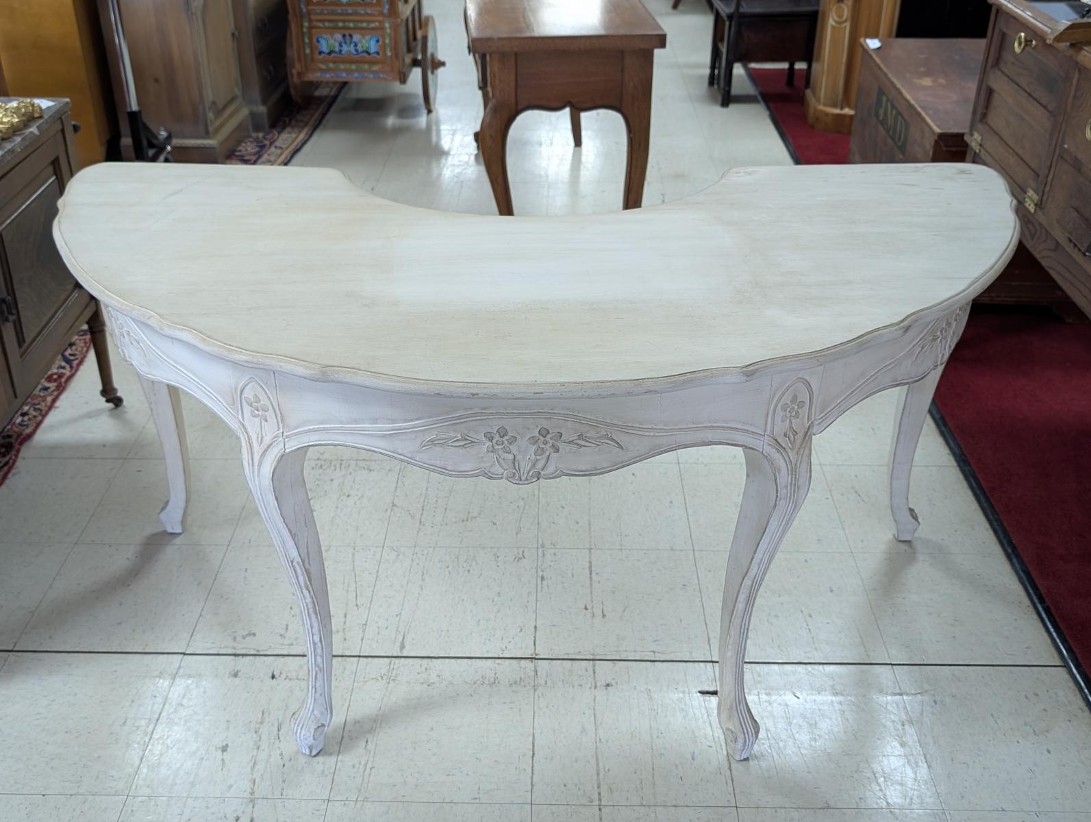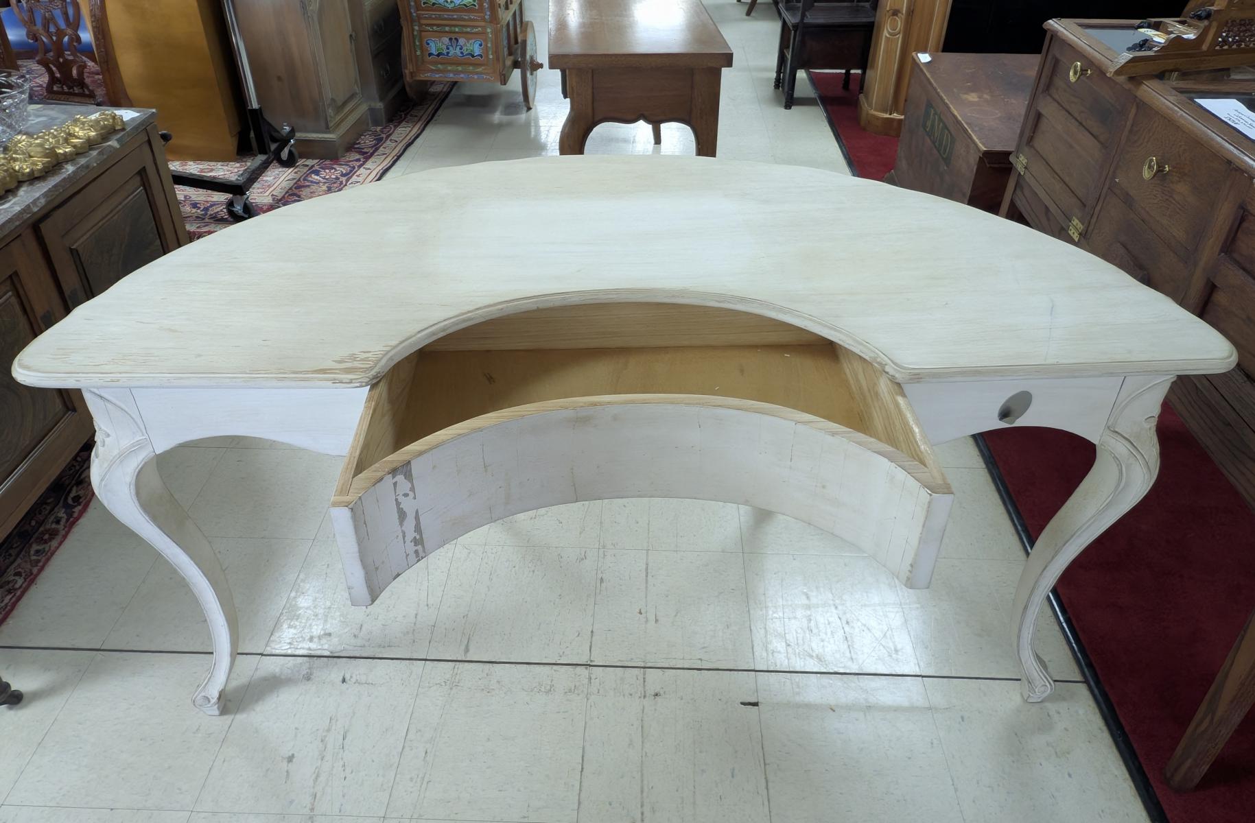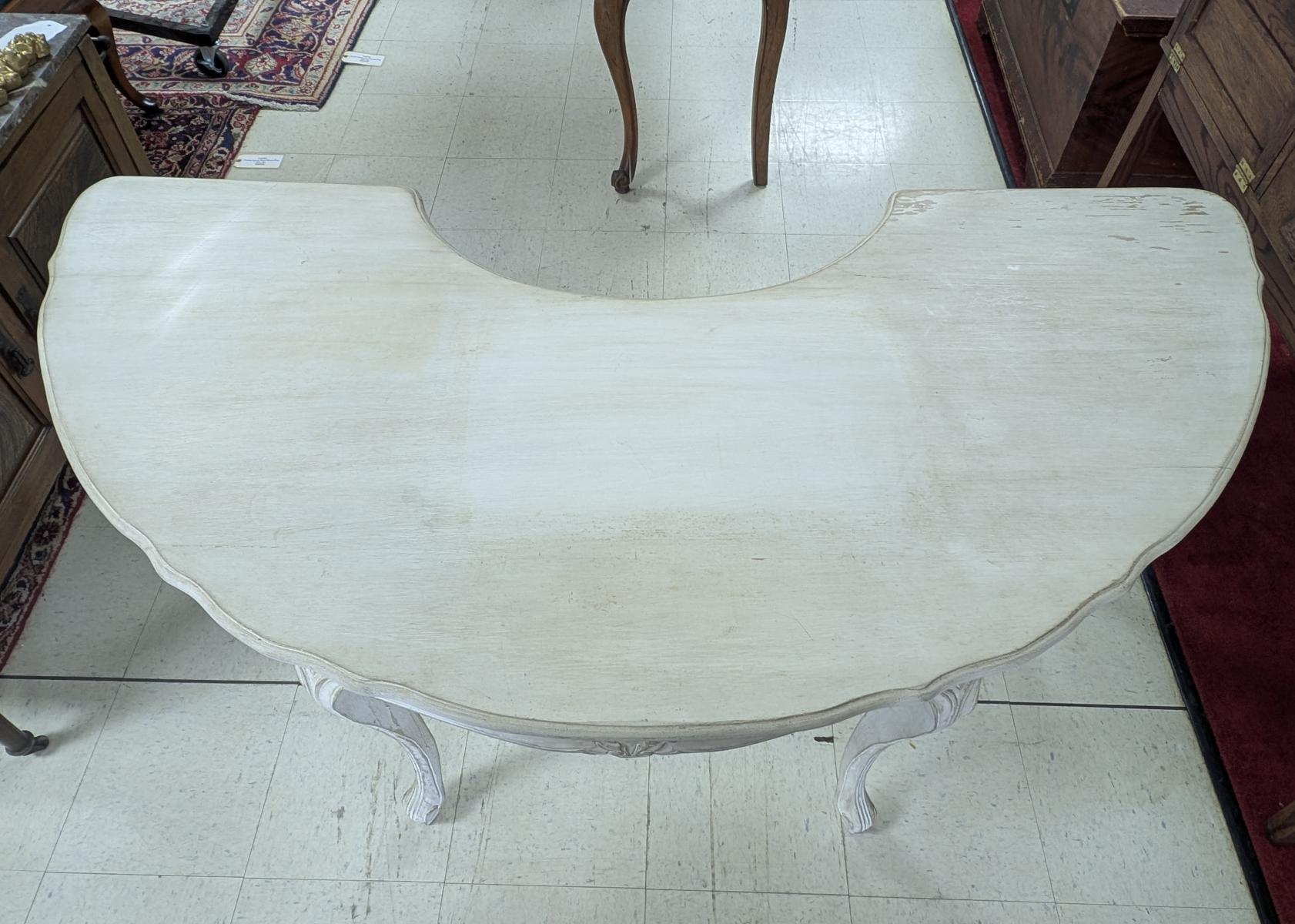 | FEATURES: | Vintage French Country Serpentine Half Circle Writing Desk, Painted, 61"W |