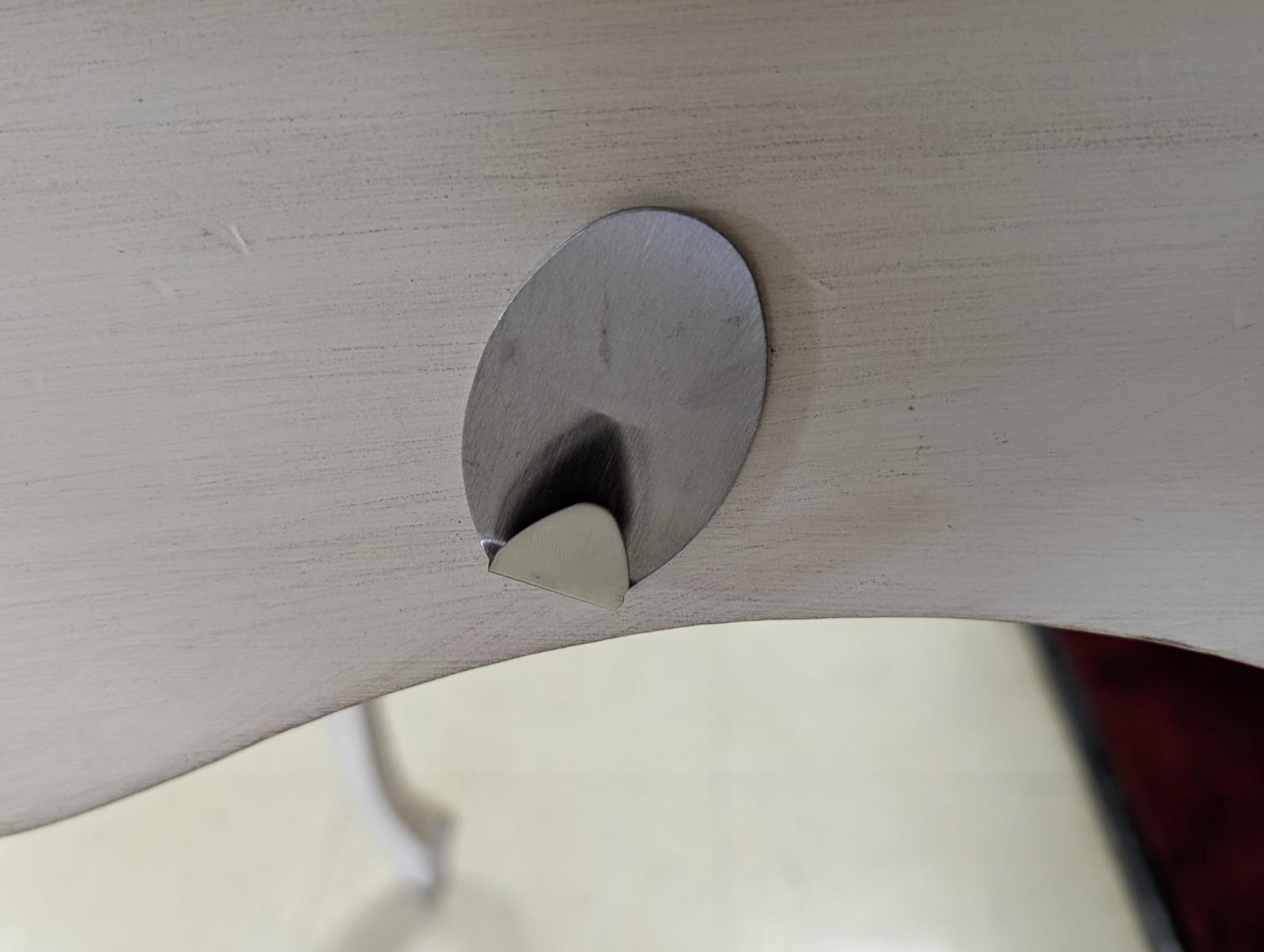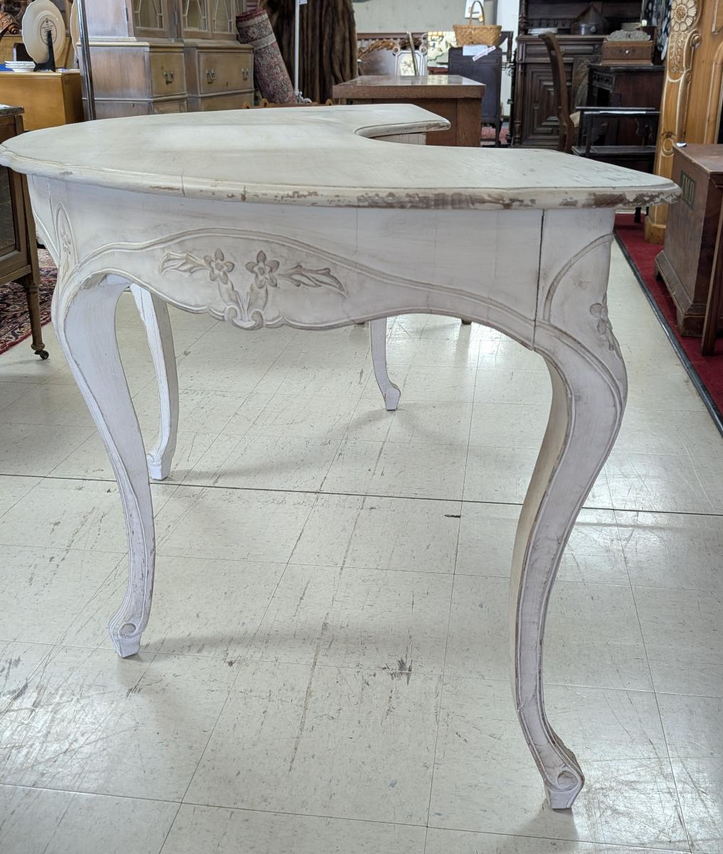 Lovely vintage desk, Half circle shape, Carved apron, Large curved drawer, Carved legs, Rest on hoof like feet, Off white paint. Very good condition, minor wear, some flaked paint areas, Staining and discoloration on top. See all photos for condition. Measures: 29.5″H x 61″W x 31″D. Leg clearance 22.25″H.