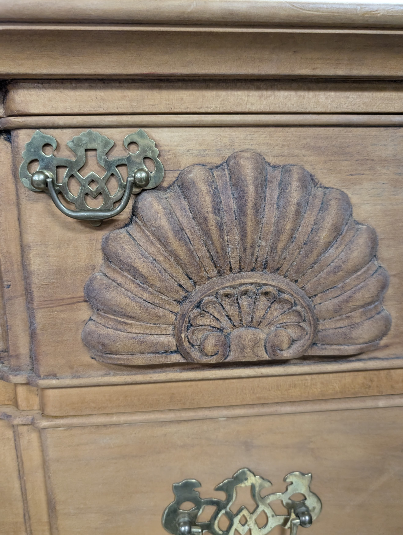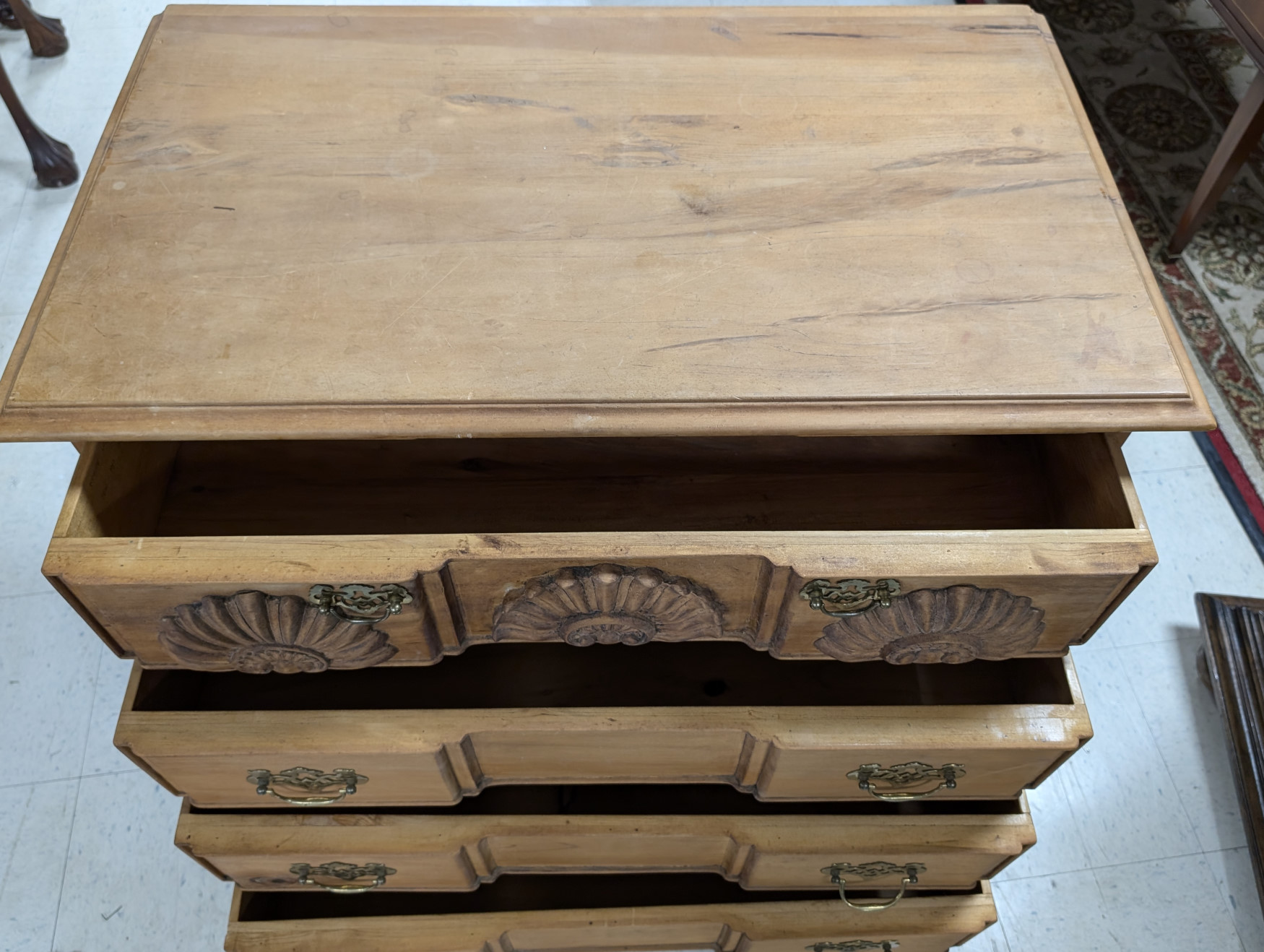 Vintage, Georgian Style, Solid Pine case, 4 Dovetailed drawers, Carved front, Brass hardware, Bracket feet. Very good condition, some scratches and wear. See all photos. We have 2 available. Price is for one! See last photo. Measures : 35″H x 36″W x 20.5″D.