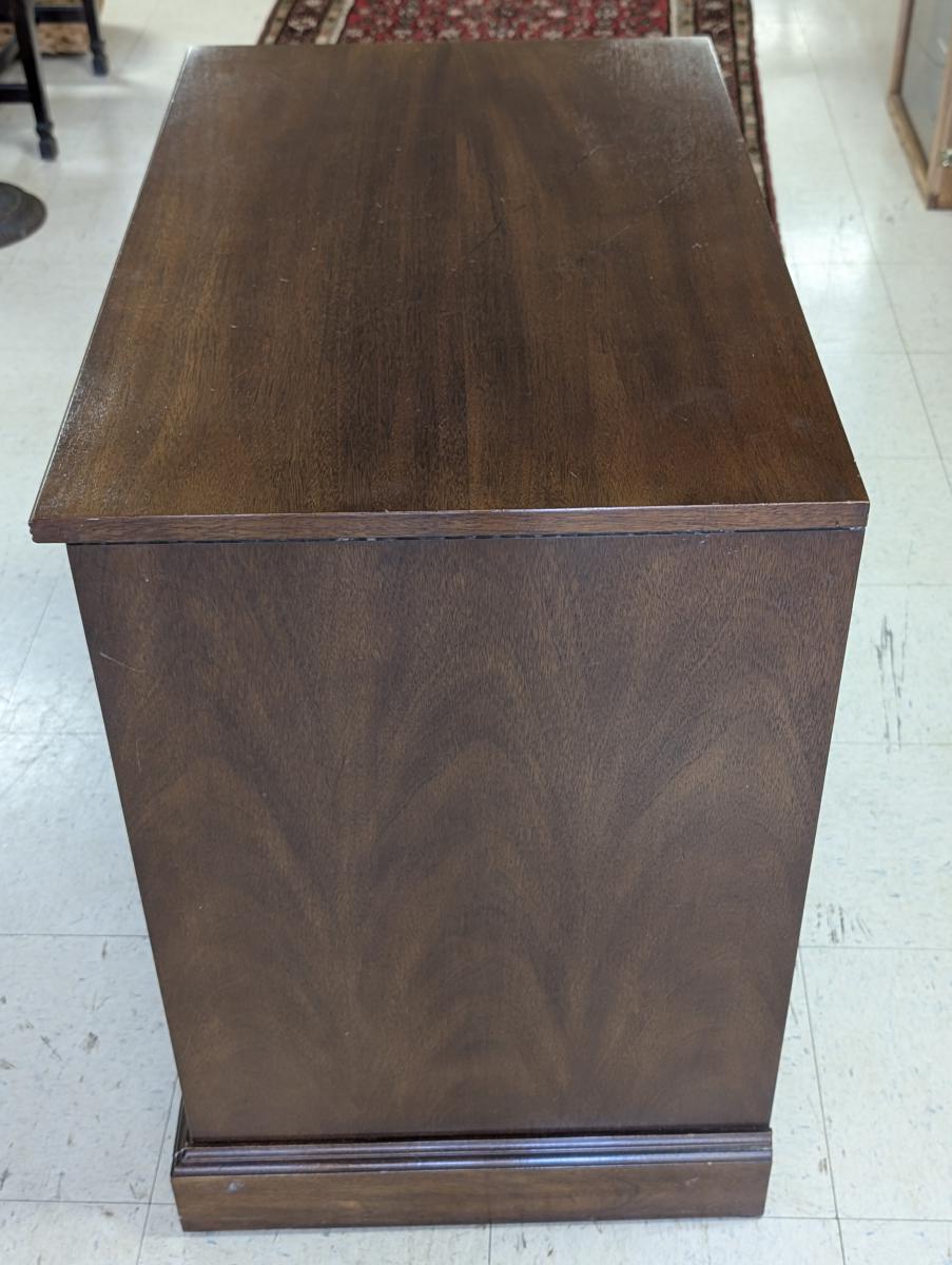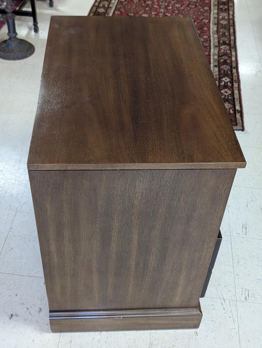 Vintage, National Mt. Airy, Lateral File Cabinet, Credenza, Mahogany Case, 2 Dovetailed Drawers, Bottom has one file drawer. Very good, sturdy condition, minor wear and some scratches due to use and age. See all photos. Measures: 30″H x 32.5″W x 20″D.