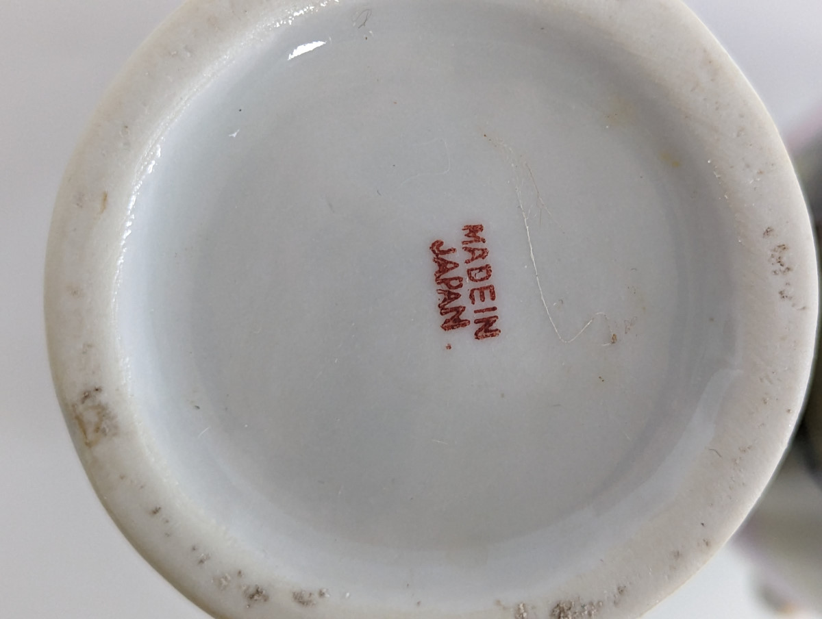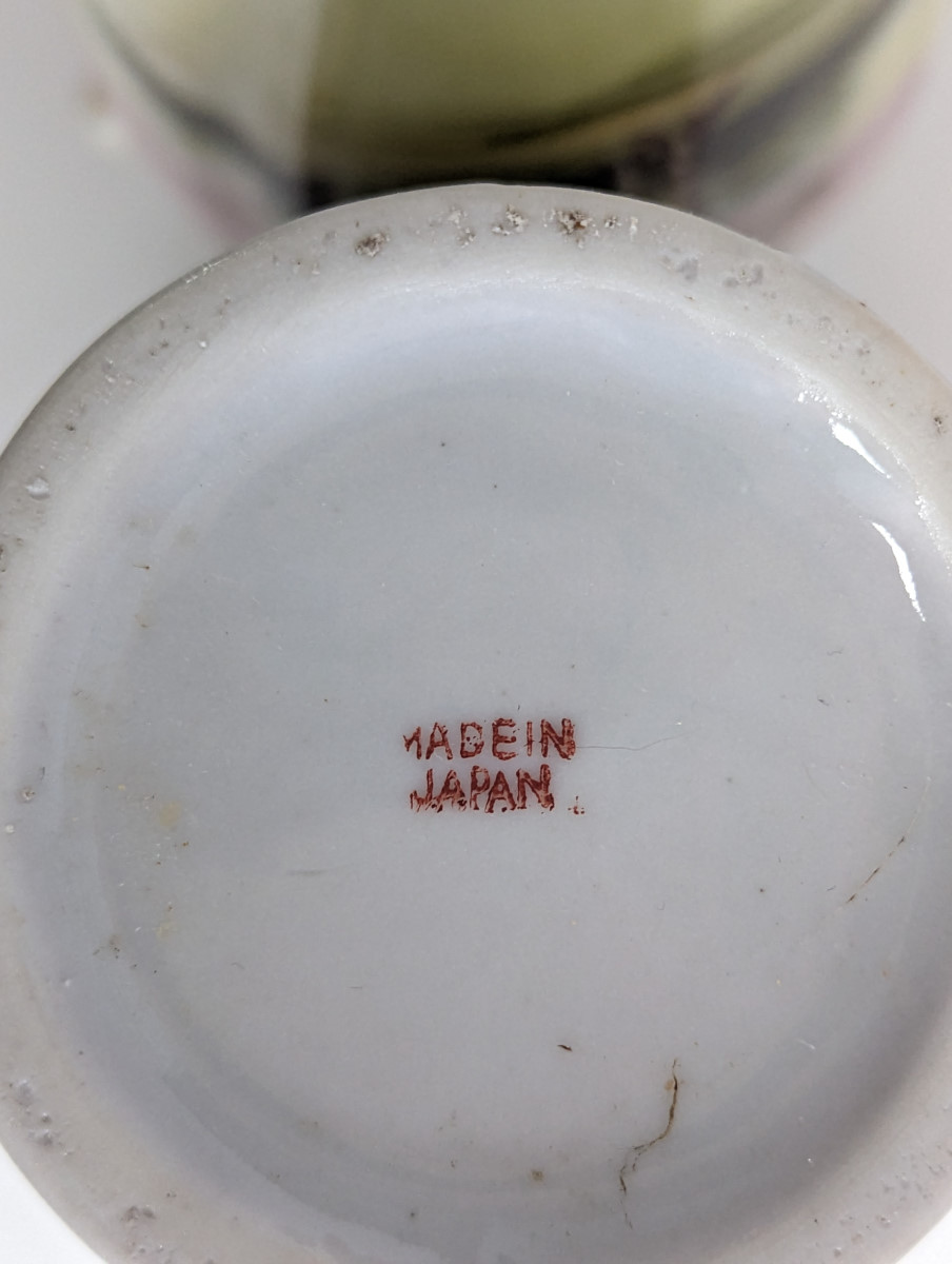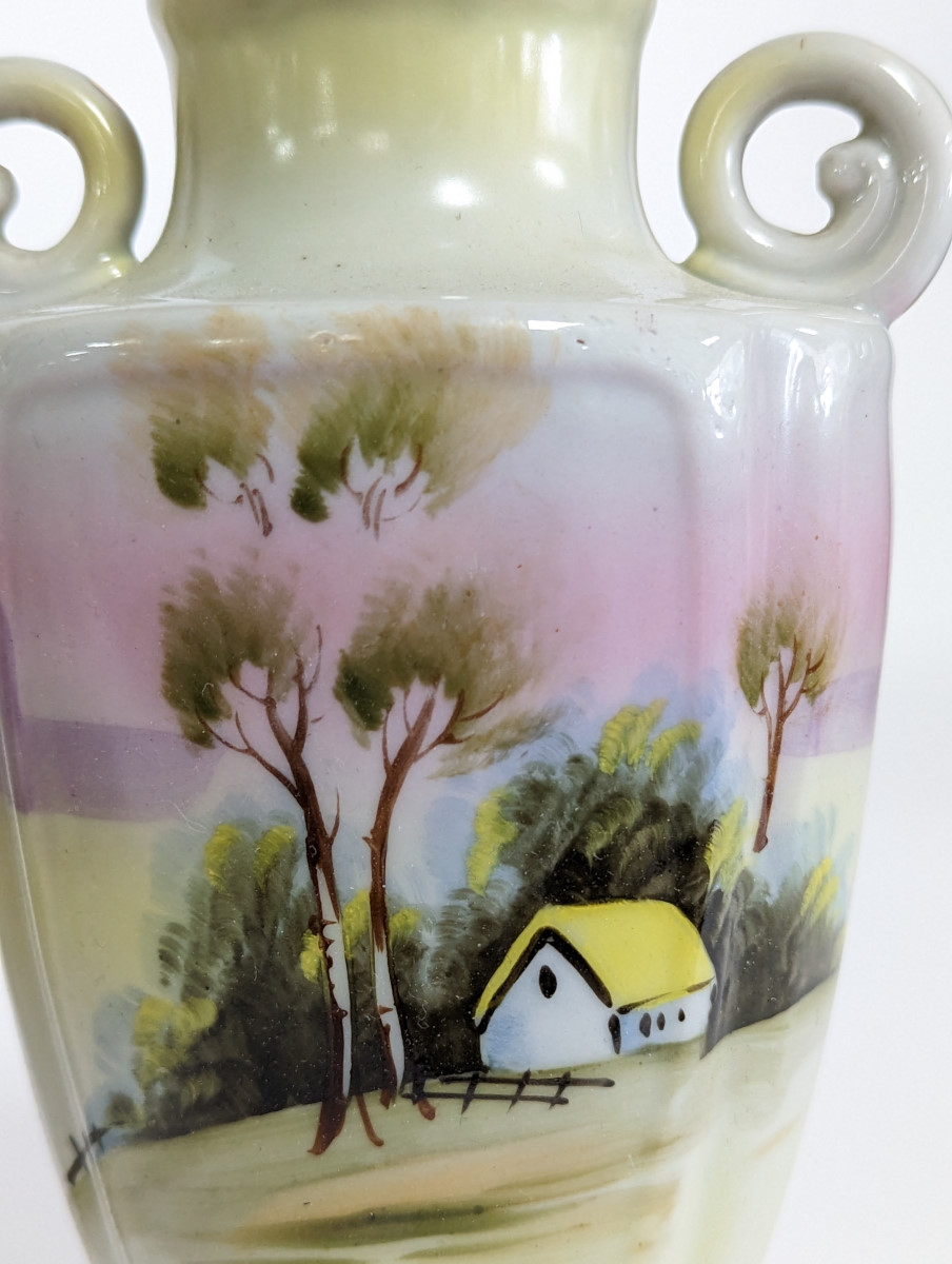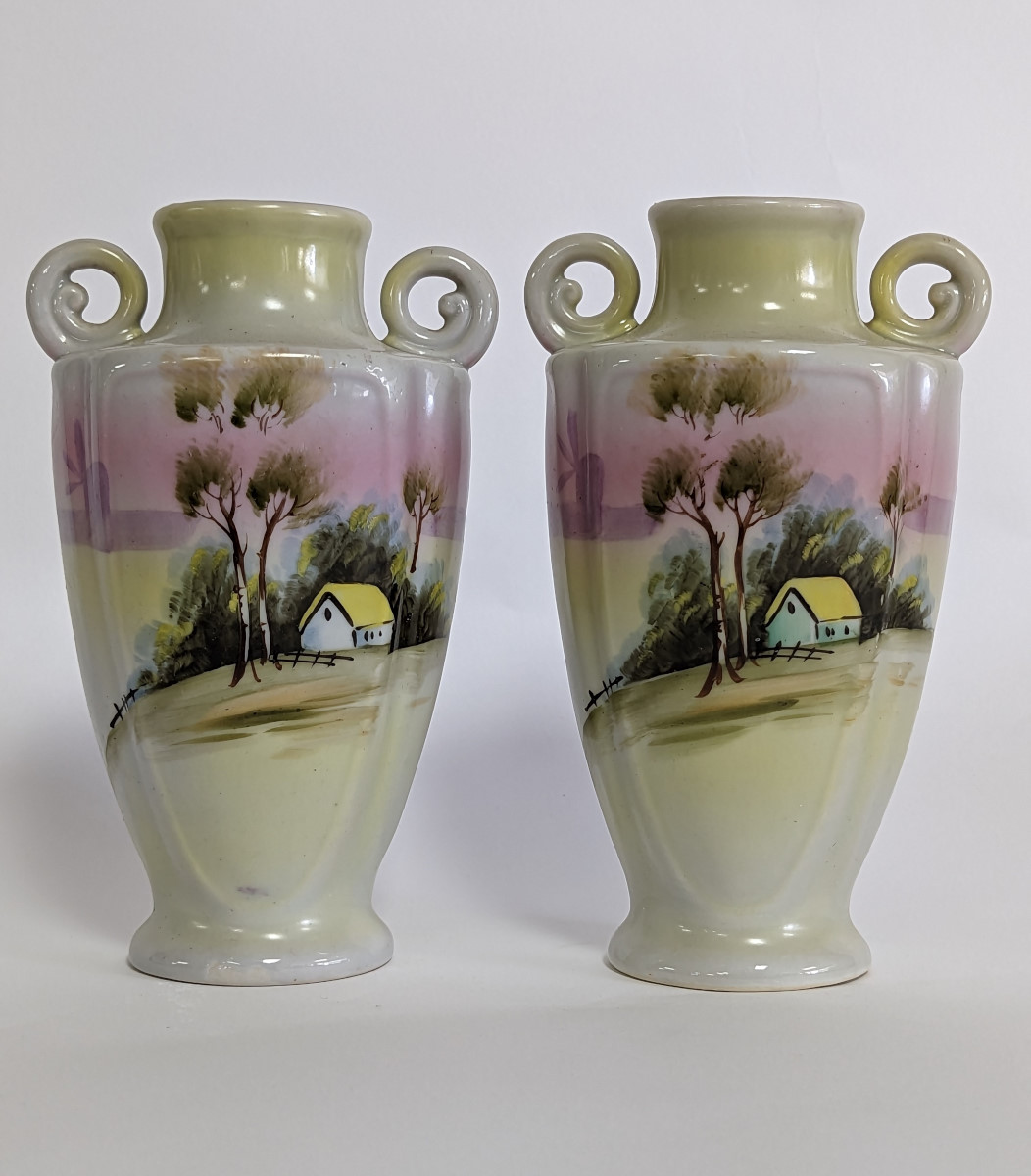 Lovely Pair of porcelain vases, By Noritake, Hand painted, Made in Japan, Cottage scene. In very good condition, no chips or cracks. See all photos for condition. Measures: 7.5”H x 4.5” (handle to handle). Shipping within the US for $12.95.