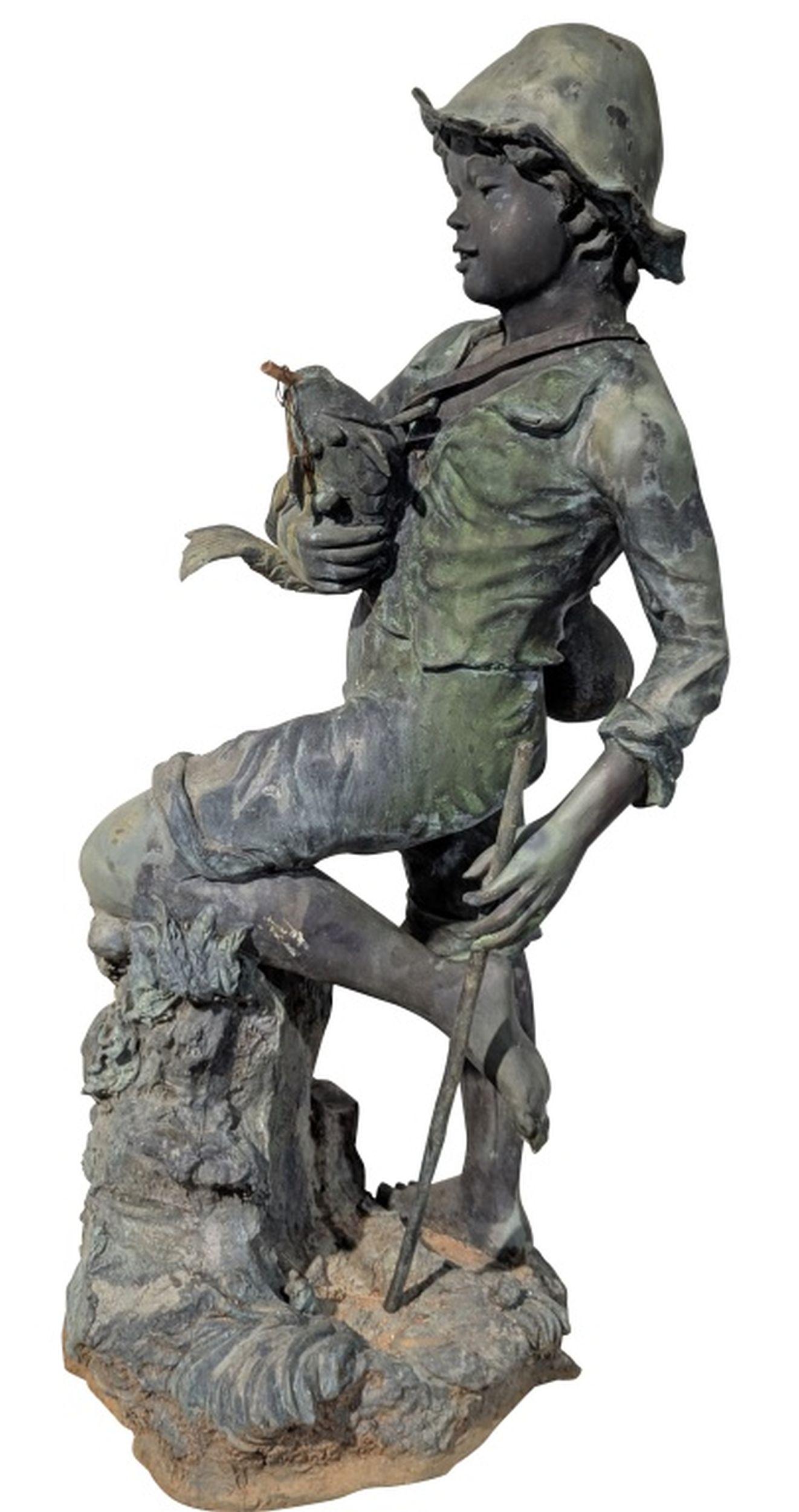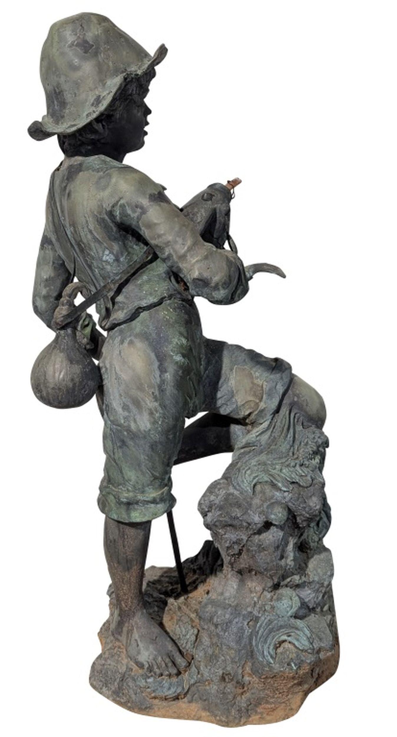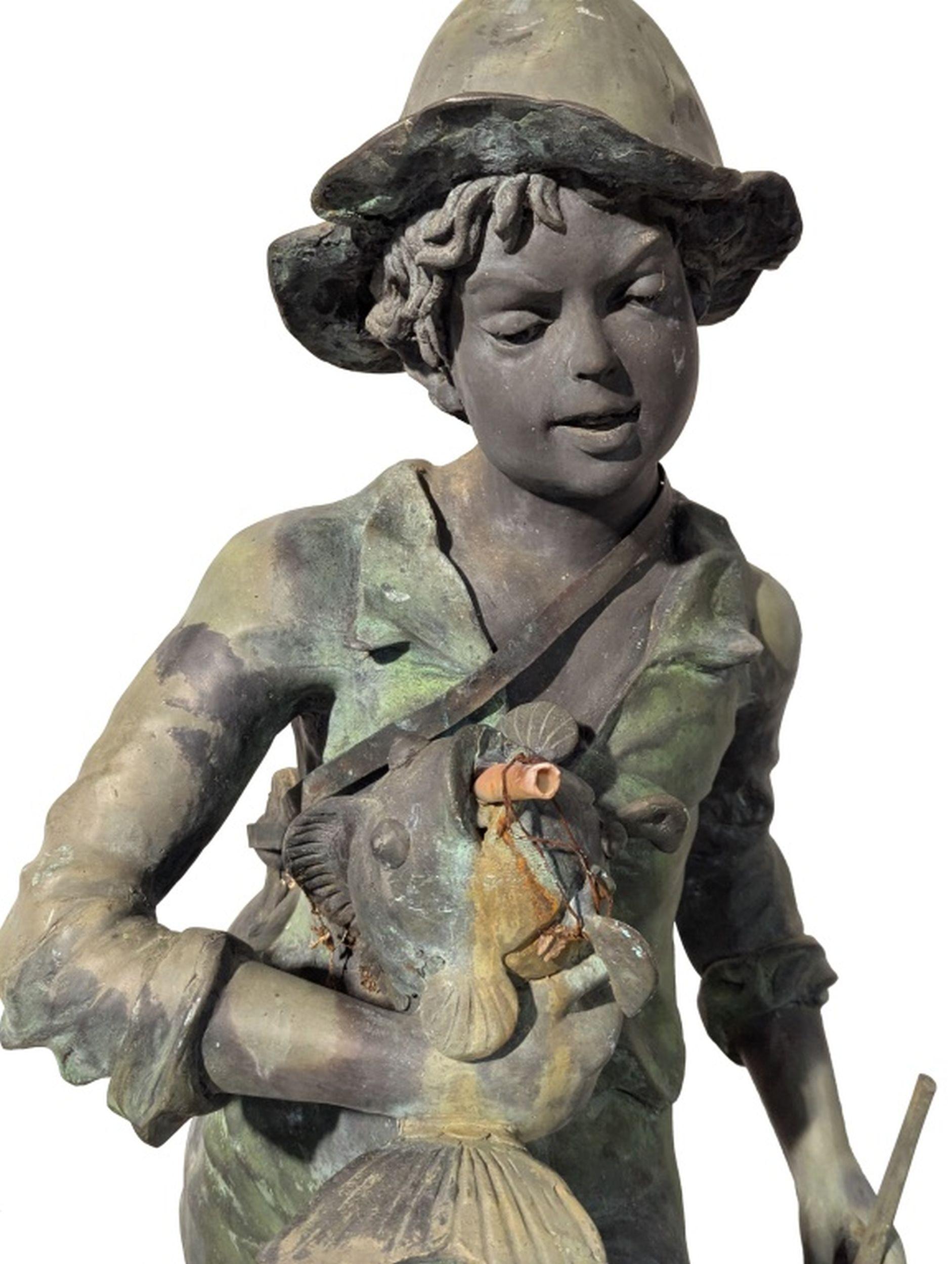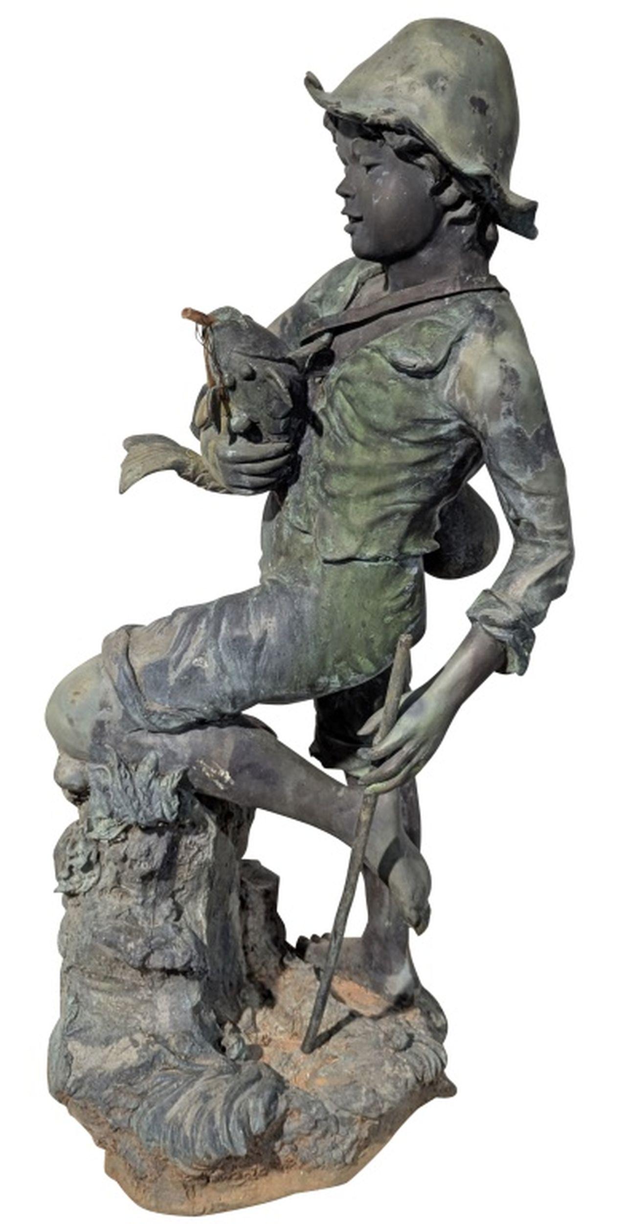Vintage Patinated Bronze Boy Fisherman Fountain