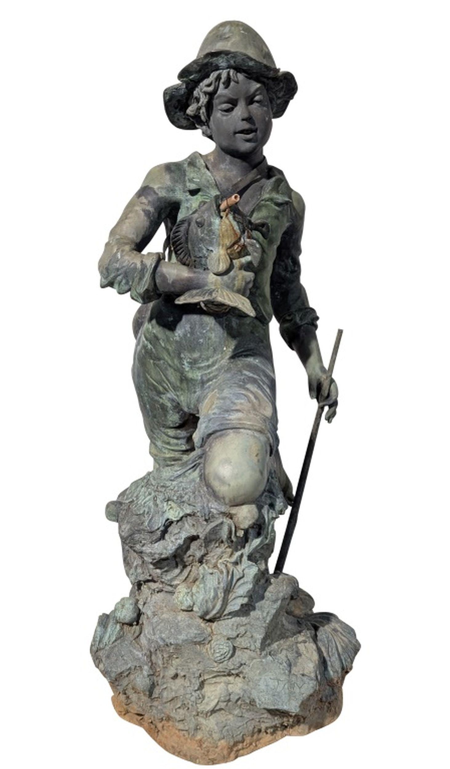 | FEATURES: | Vintage Patinated Bronze Boy Fisherman Fountain, 47"H |